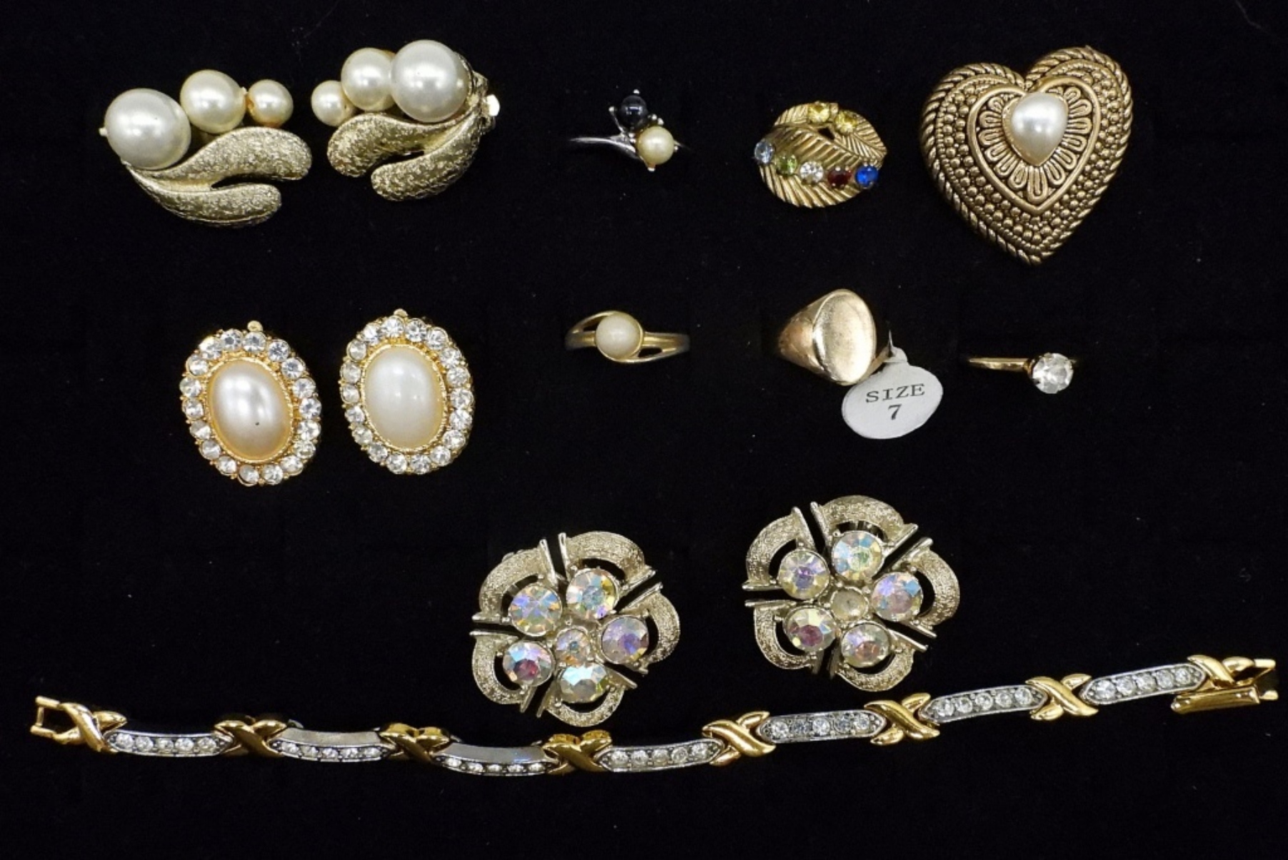 TWO PAIR OF VINTAGE CORO CLIP ON EARRINGS. FIVE FASHION RINGS, SIZES 5, 7, 8. BRACELET 7″. GOLD TONE CLIP ON EARRINGS AND HEART SHAPED PIN.