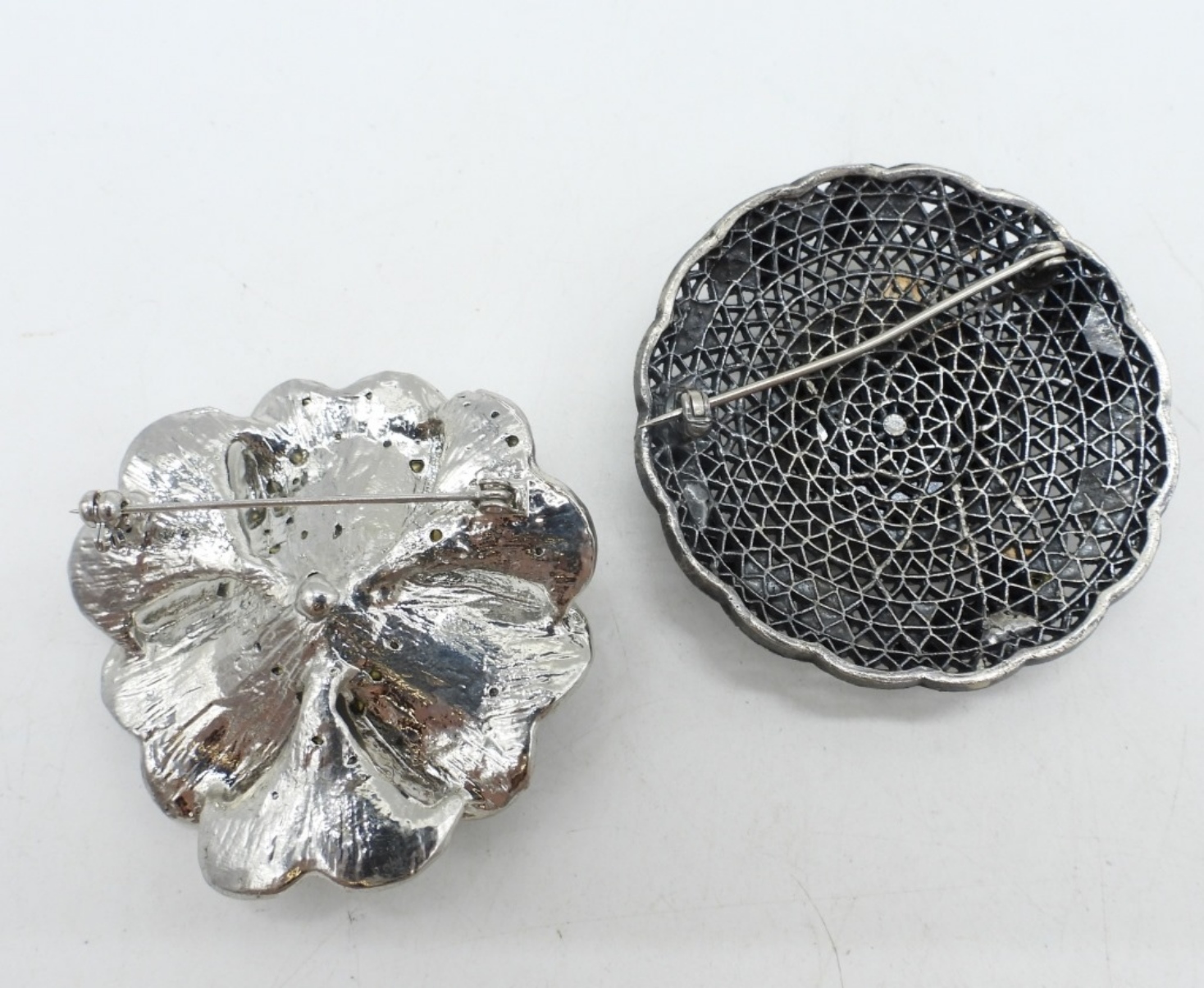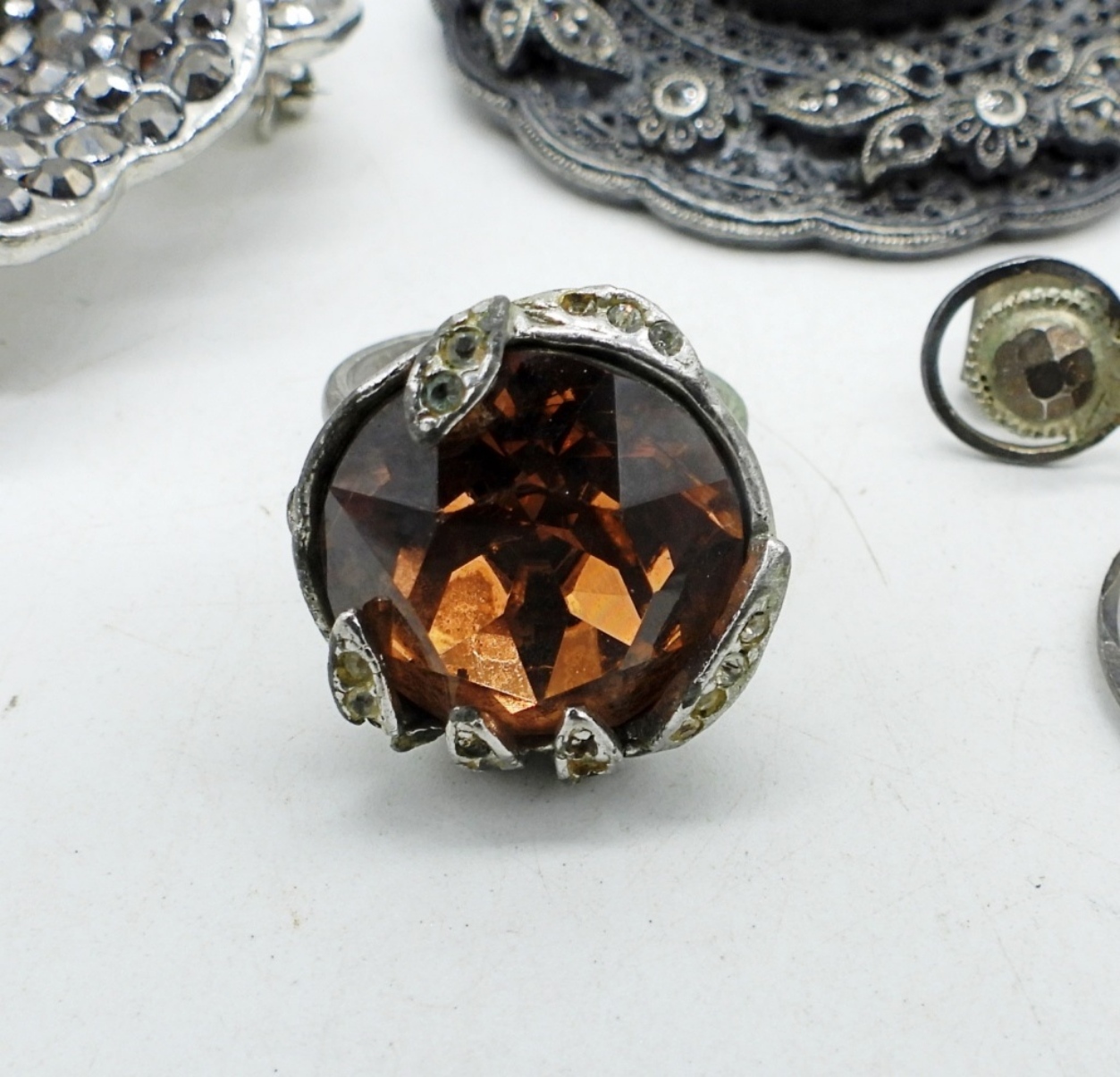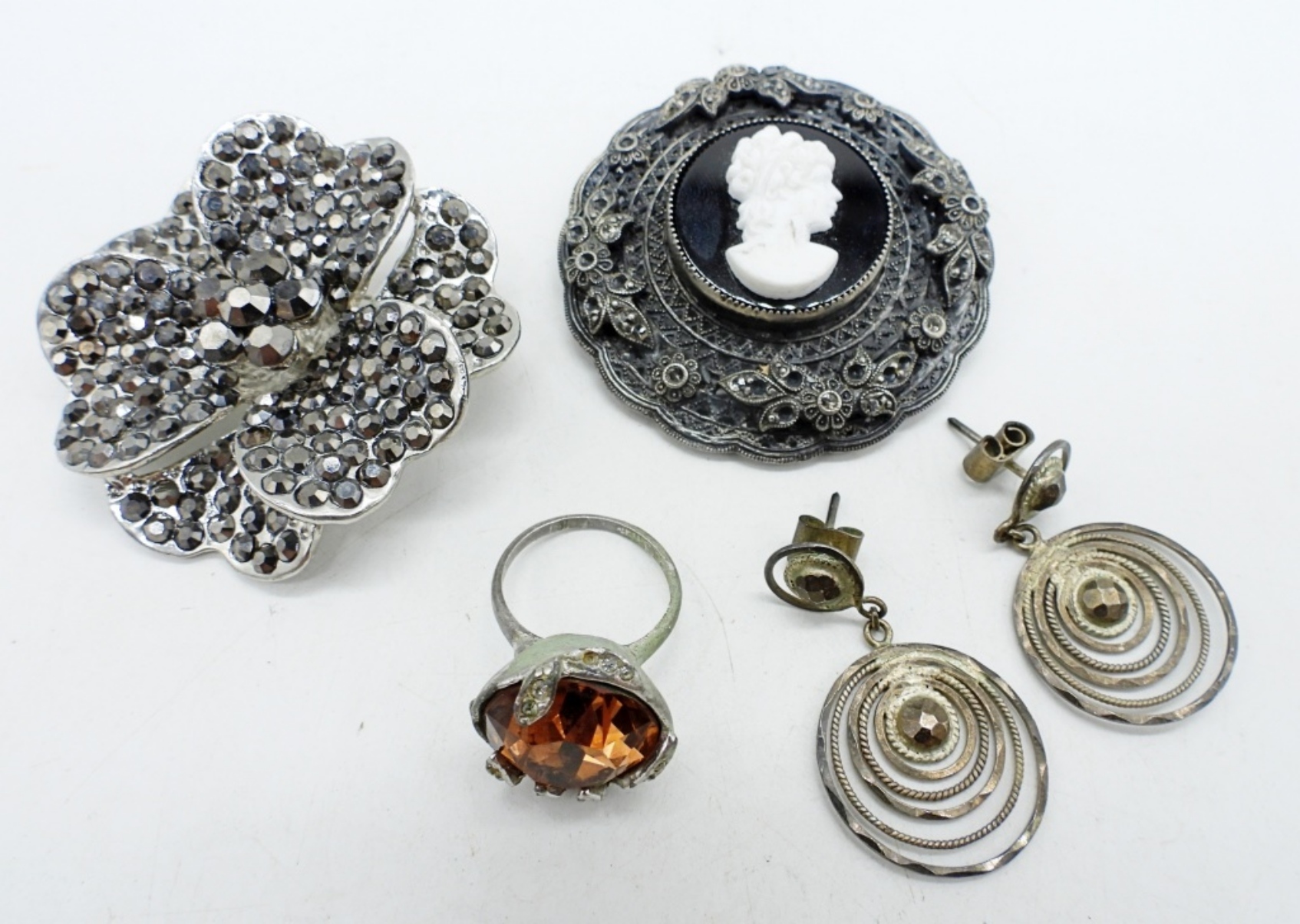 LARGE SILVER / BLACK TONE CAMEO BROOCH, 2″. BLACK GEMSTONE FLOWER BROOCH, 2″. FASHION RING, SIZE 6.5. VTG SILVER TONE PIERCED EARRINGS.