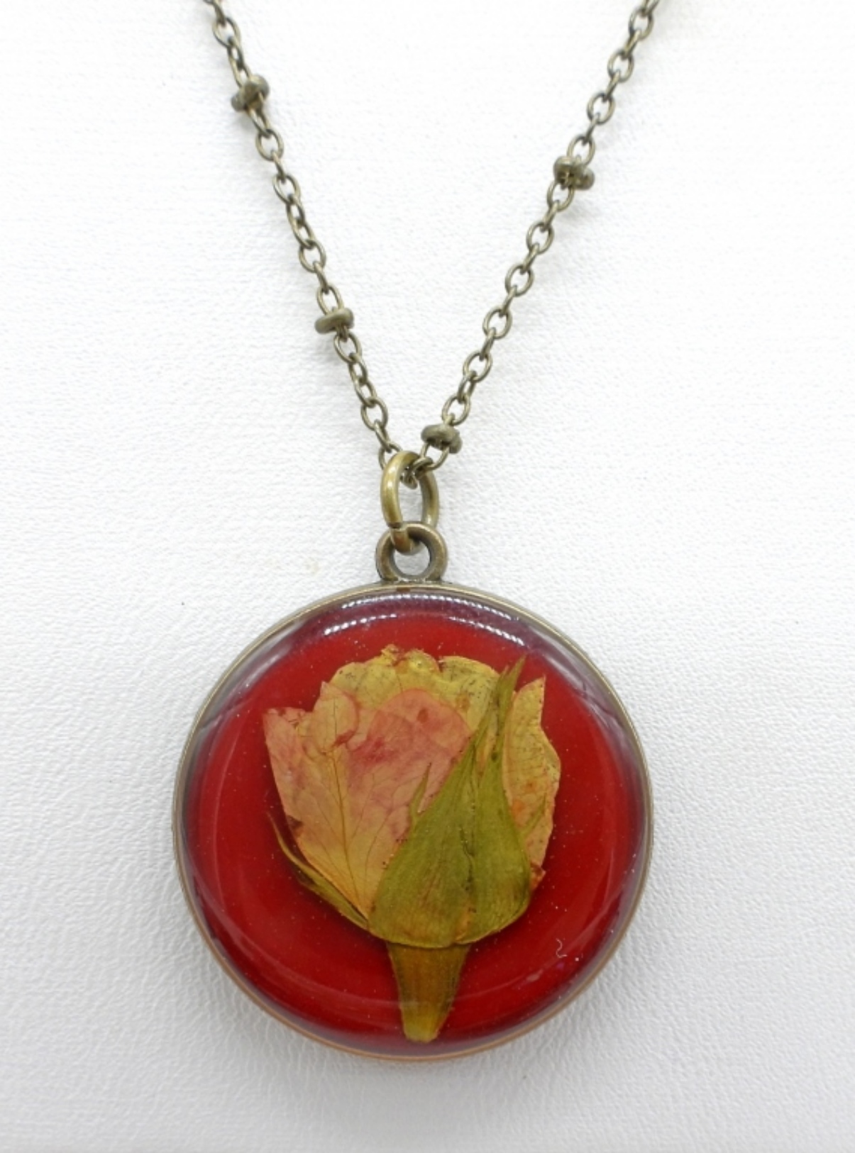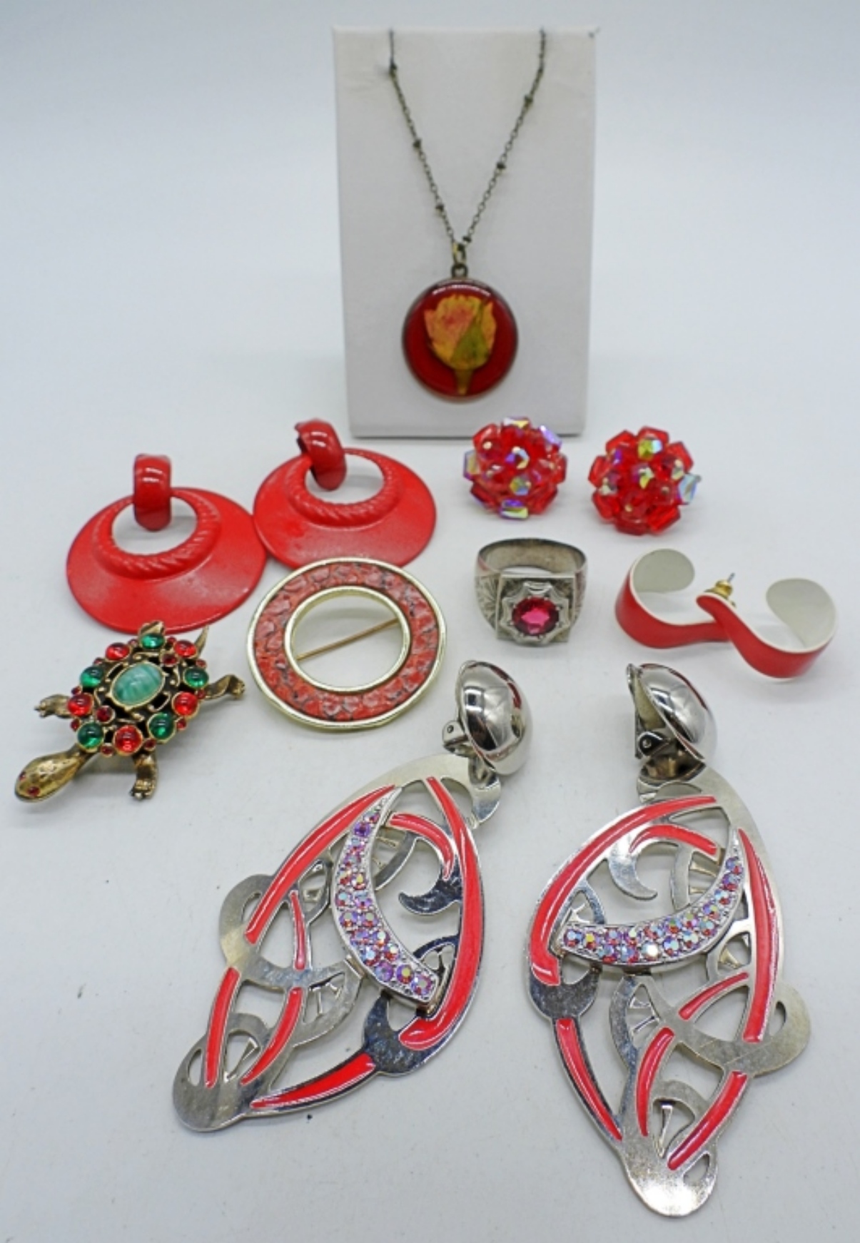 4 PAIR OF VINTAGE RED EARRINGS, PIERCED & CLIP ON. TWO PINS. ONE RING, SIZE 10. PRESSED FLOWER PENDANT ON A 26″ VINTAGE CHAIN.