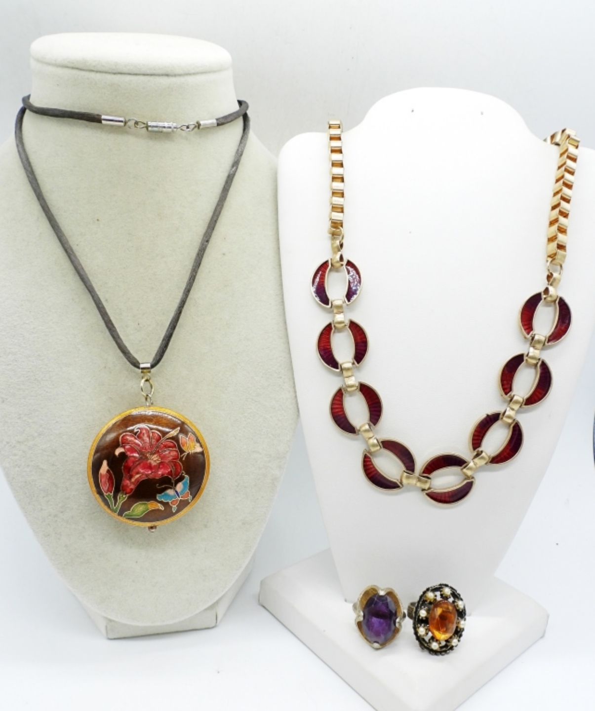 CLOISONNE PENDANT ON A 24″ CORD. TWO RINGS, BOTH ADJUSTABLE. VINTAGE GOLD TONE / RED NECKLACE 18″.