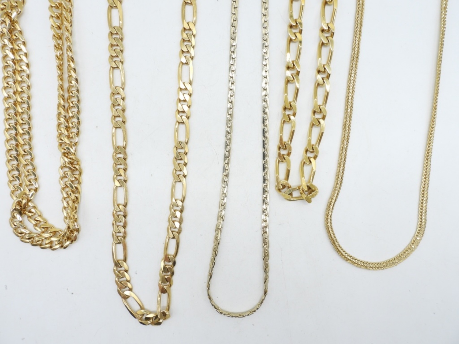 FIVE GORGEOUS GOLD TONE GOLD CHAINS, 15-30″.