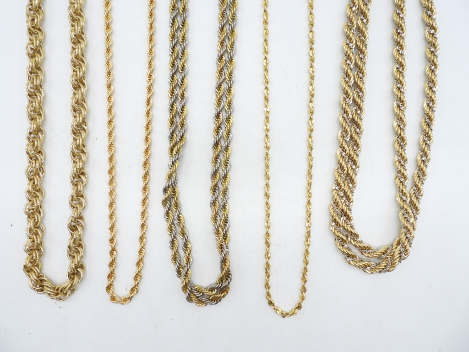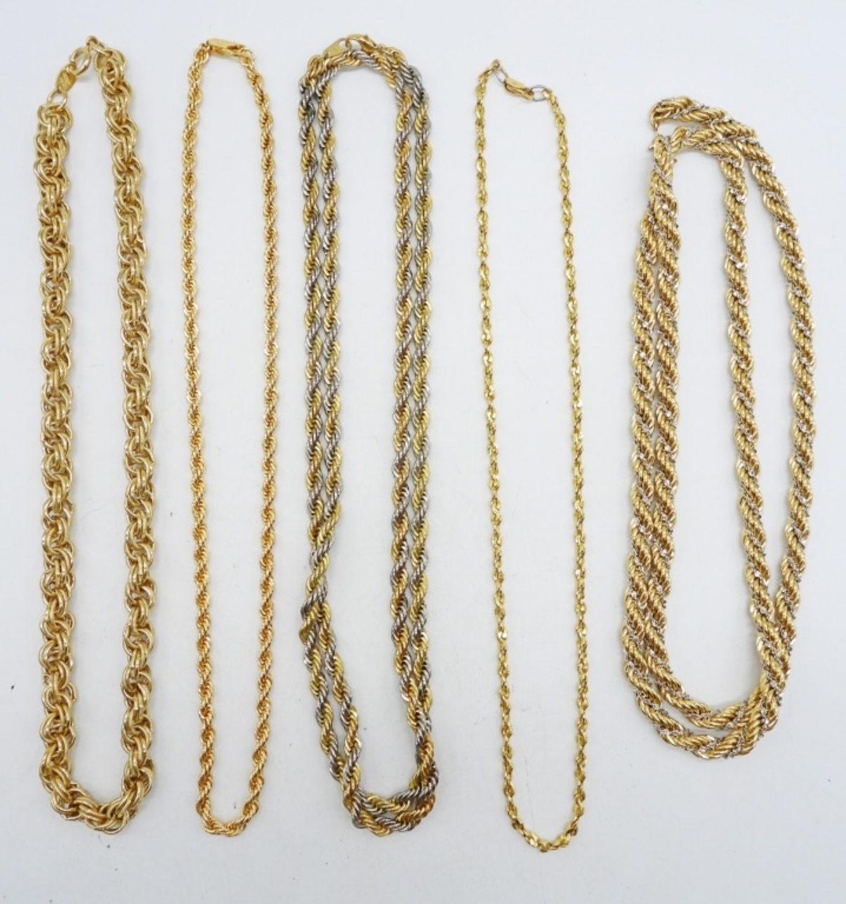 FIVE GOLD AND SILVER TONE CHAINS. ALL IN VERY NICE CONDITION. TRIFARI AND MONET CHAINS, 18″ & 30″. THREE OTHER CHAINS MEASURE 18″ & 36″.