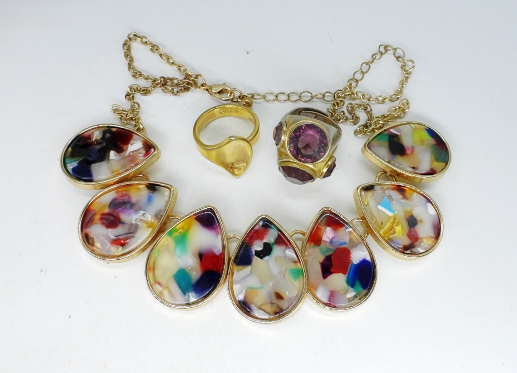 THREE PRETTY FASHION NECKLACES, 20″ & 24″. TWO RINGS, SIZE 6.