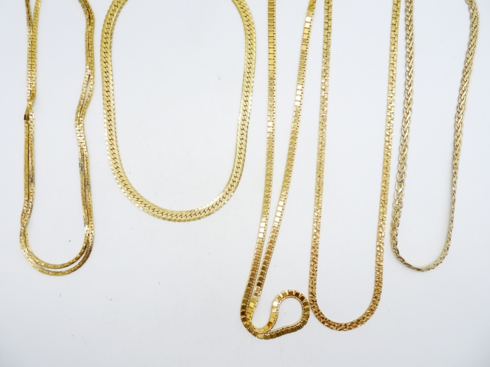 FIVE PRETTY GOLD TONE CHAINS, MONET & OTHER. 18″ – 37″.