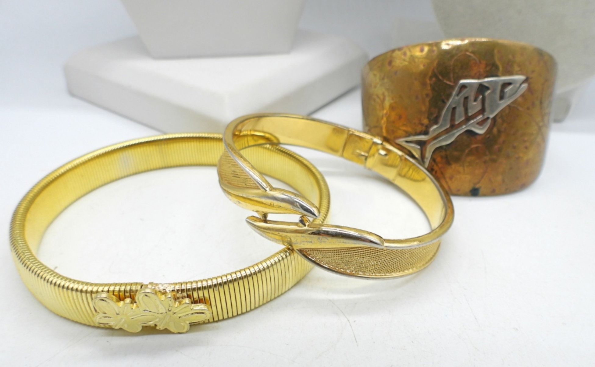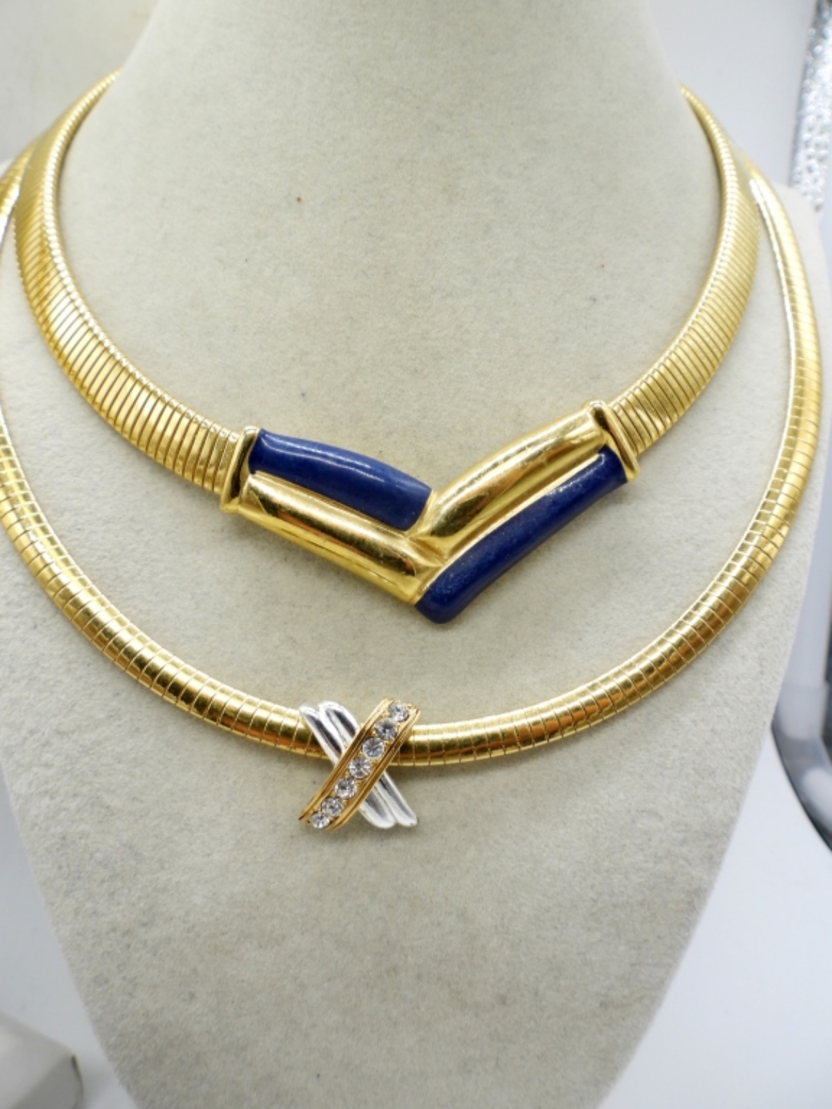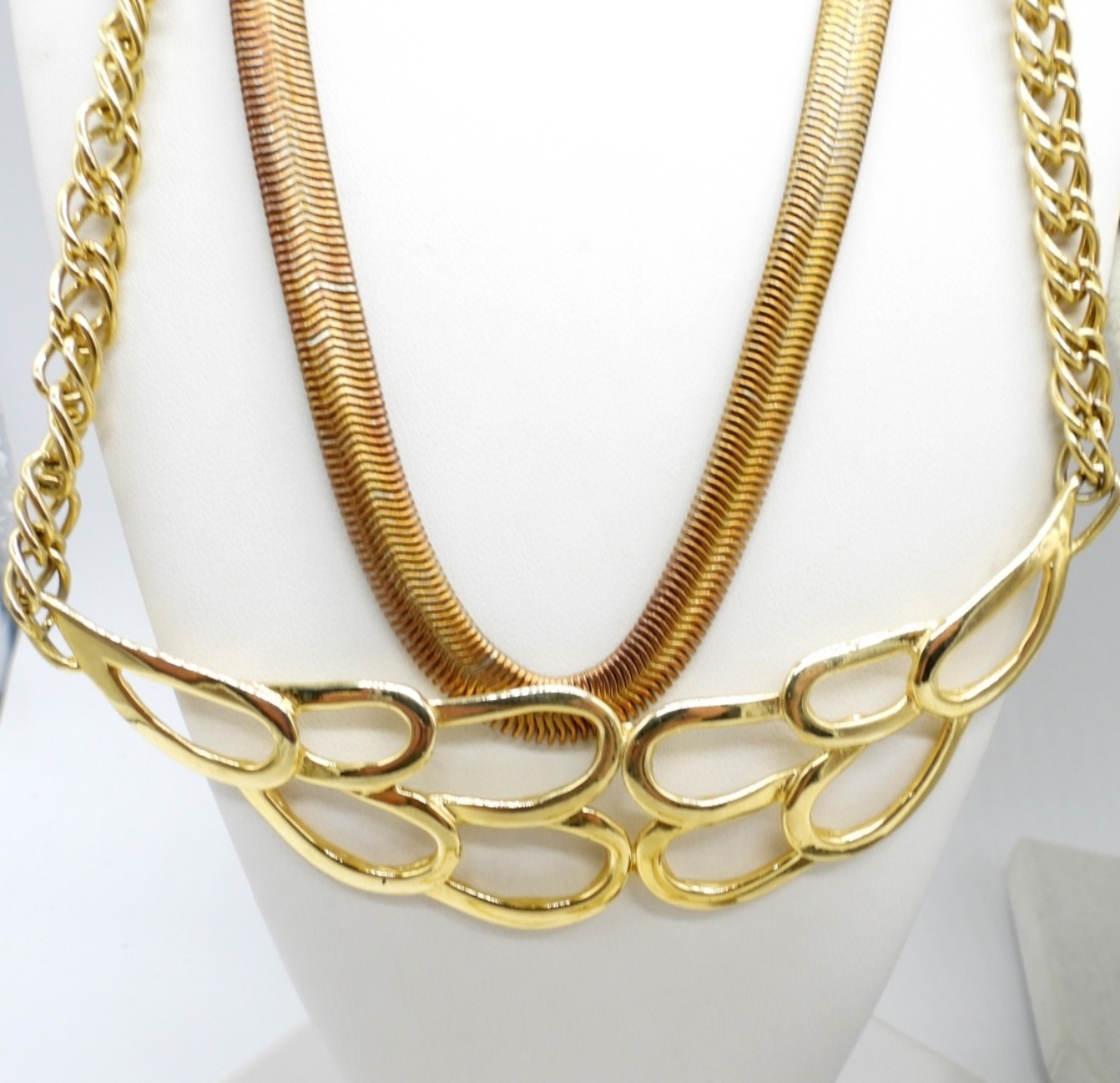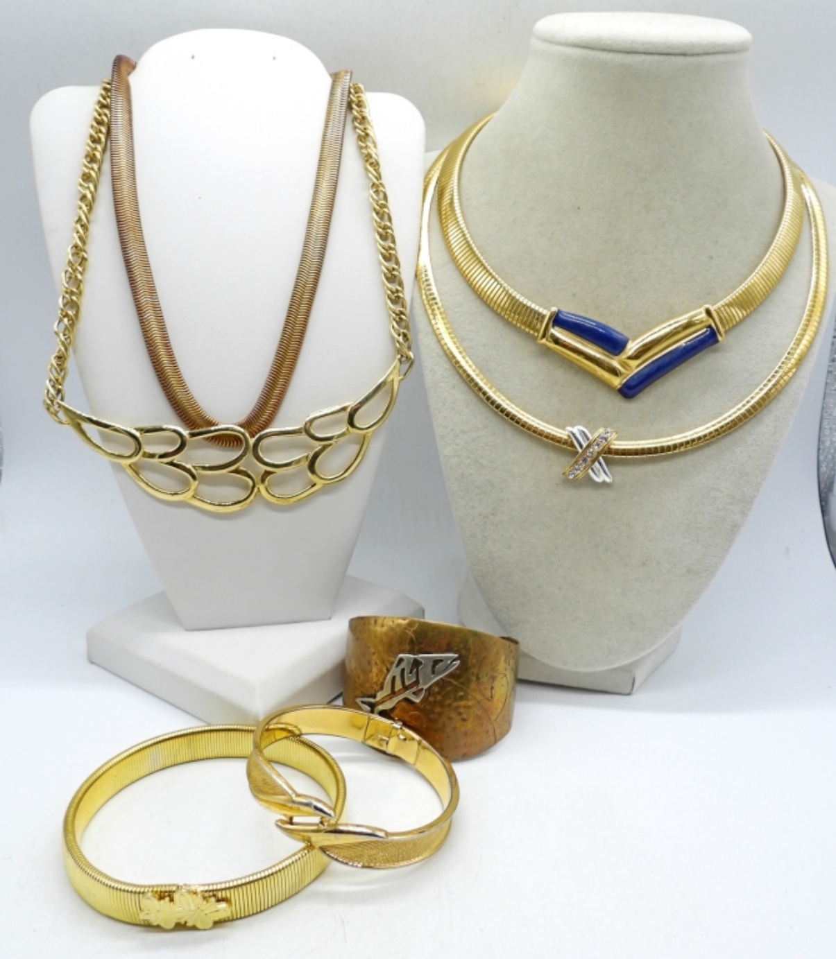 FOUR GOLD TONE FASHION NECKLACES 14-20″. THREE GOLD TONE FASHION BRACELETS 7-8″.