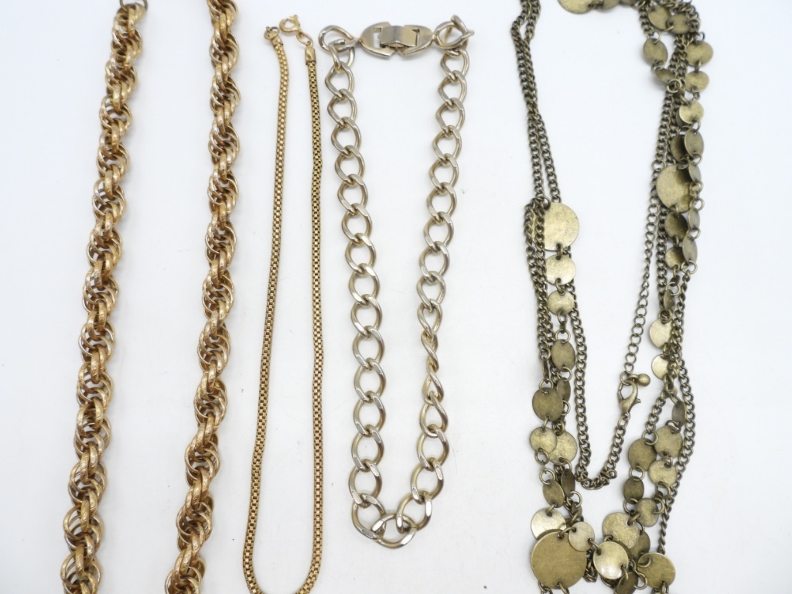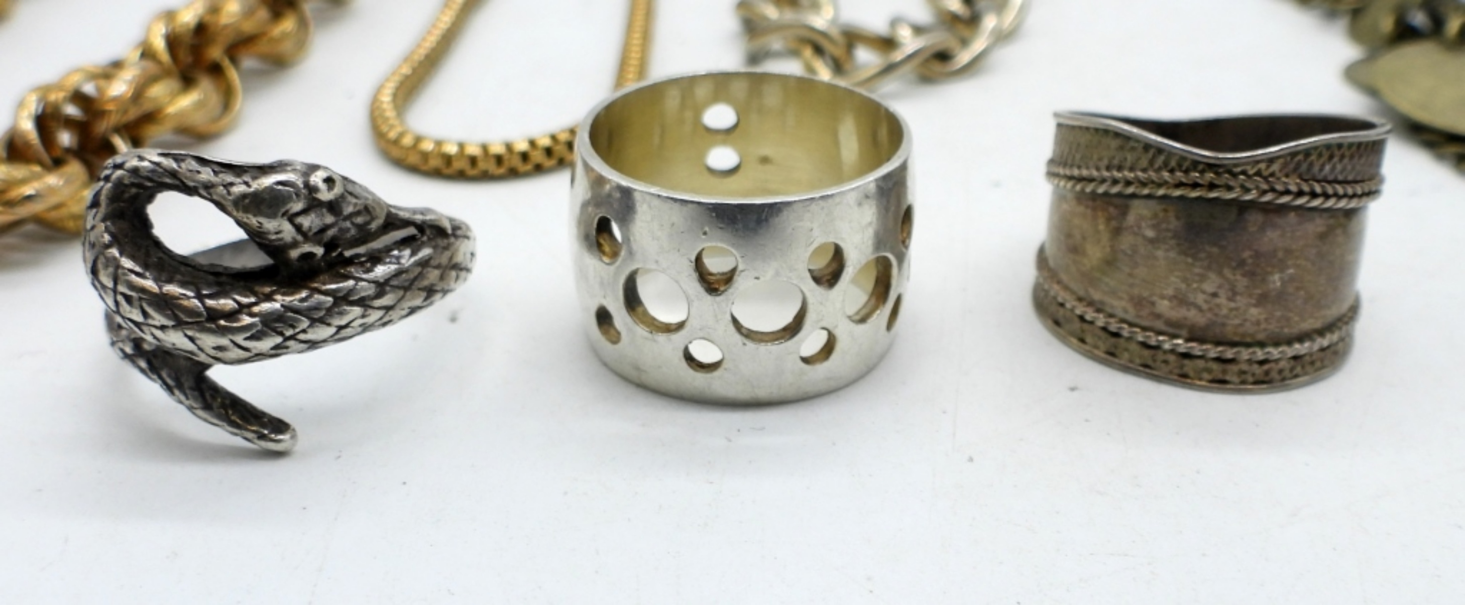 FOUR NECKLACES, 15″ & 19″. THREE SILVERTONE RINGS, SIZES 6, 7, 9