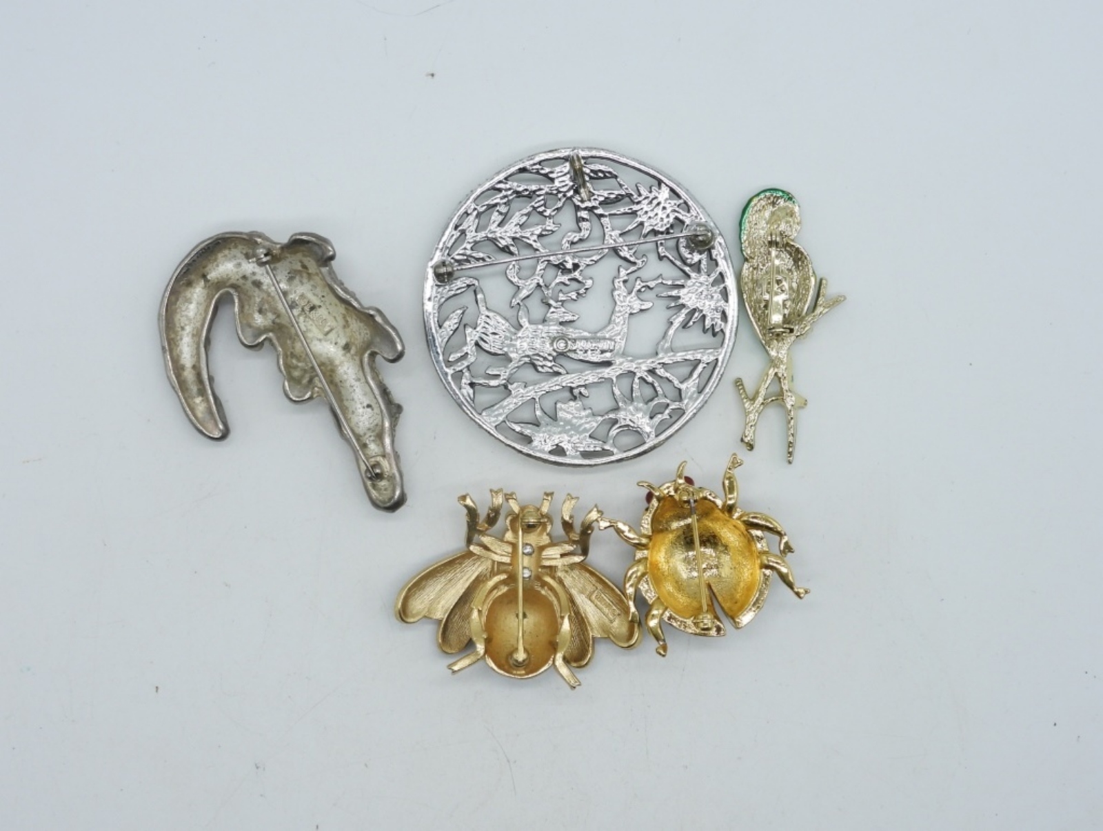 BLUE TRIFARI BUMBLEBEE BROOCH, 2″. UNSIGNED BLACK LADYBUG BROOCH. SILVERTONE DEER SARAH COVENTRY BROOCH, 2.5″. CROC & PARROT PINS, 2-2.5″.