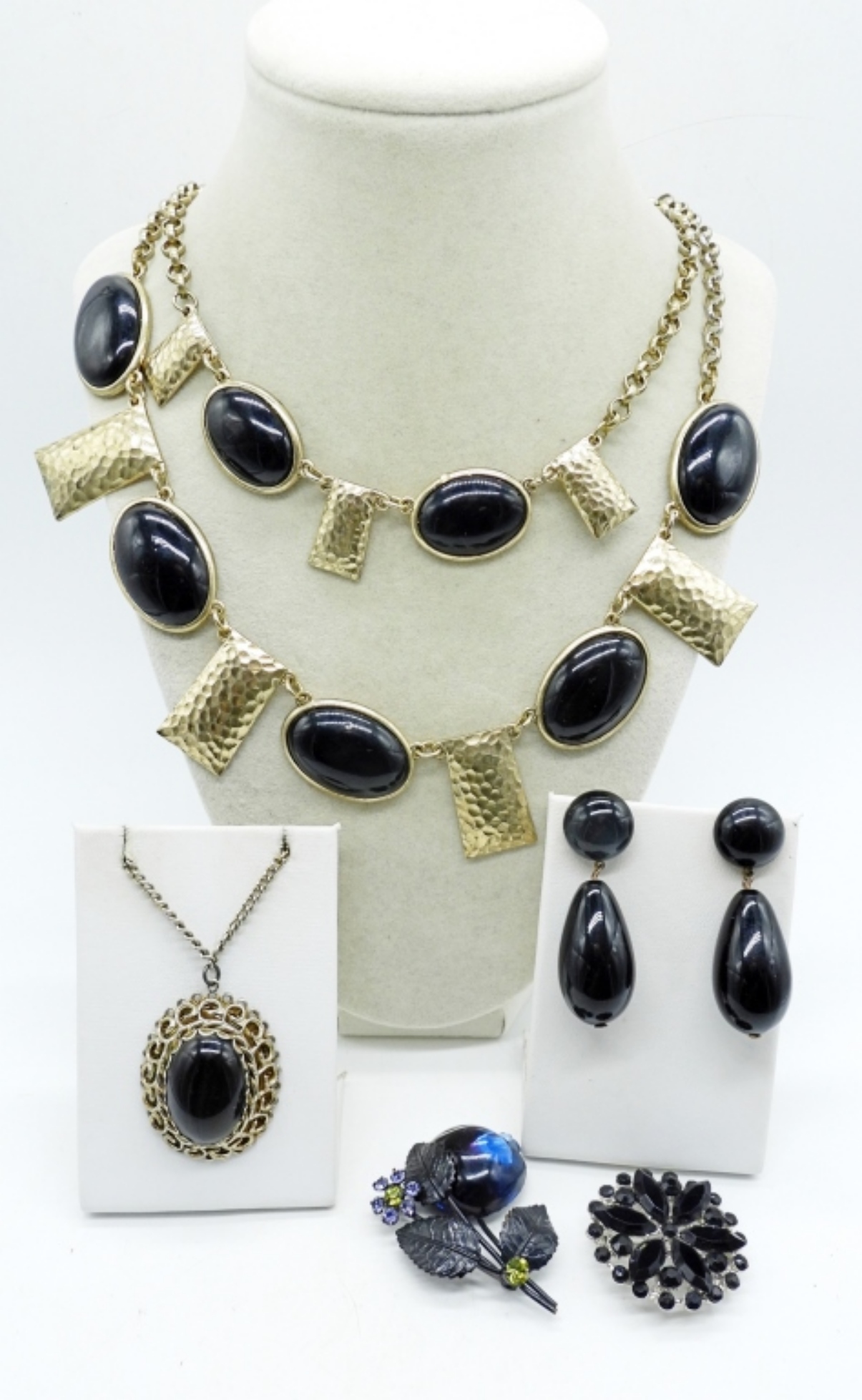 TWO NECKLACES, 20-24″. TWO BROOCHES, 1.5-2.5″. ONE PAIR PIERCED EARRINGS