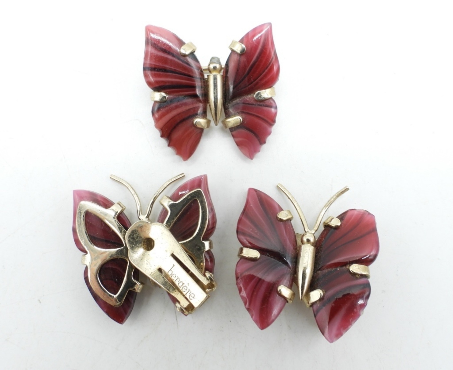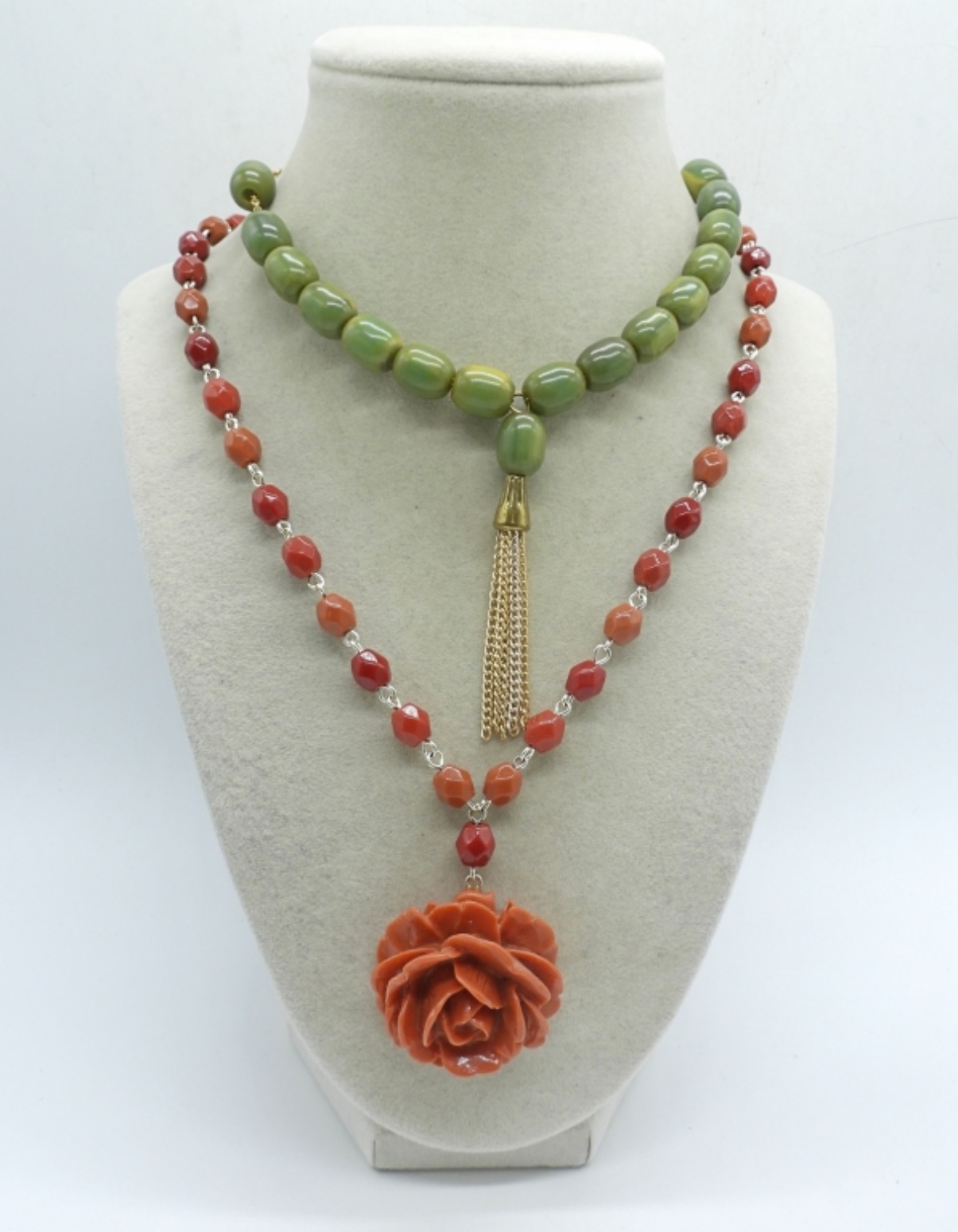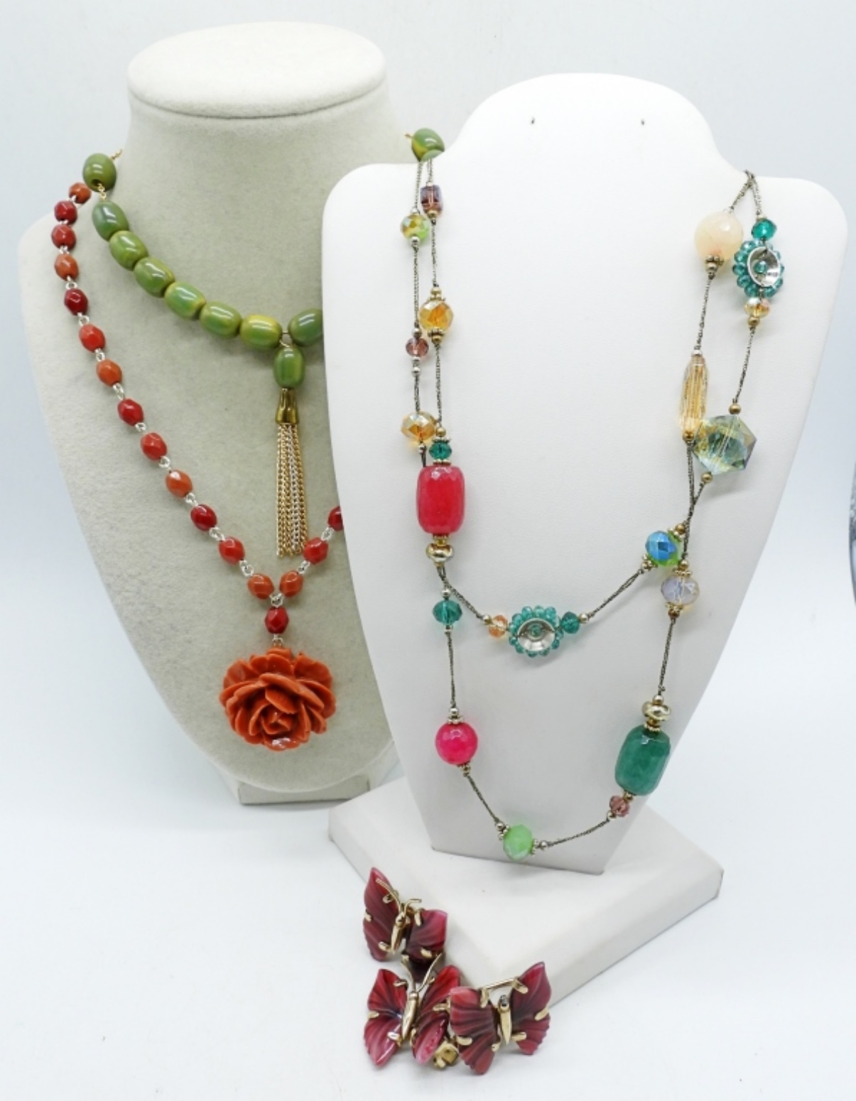 TWO GEMSTONE FASHION NECKLACES 20-40″. GREEN (MAY BE BAKELITE) BEADED PRAYER CHAIN. MATCHING BUTTERFLY PIN & CLIP ON EARRINGS