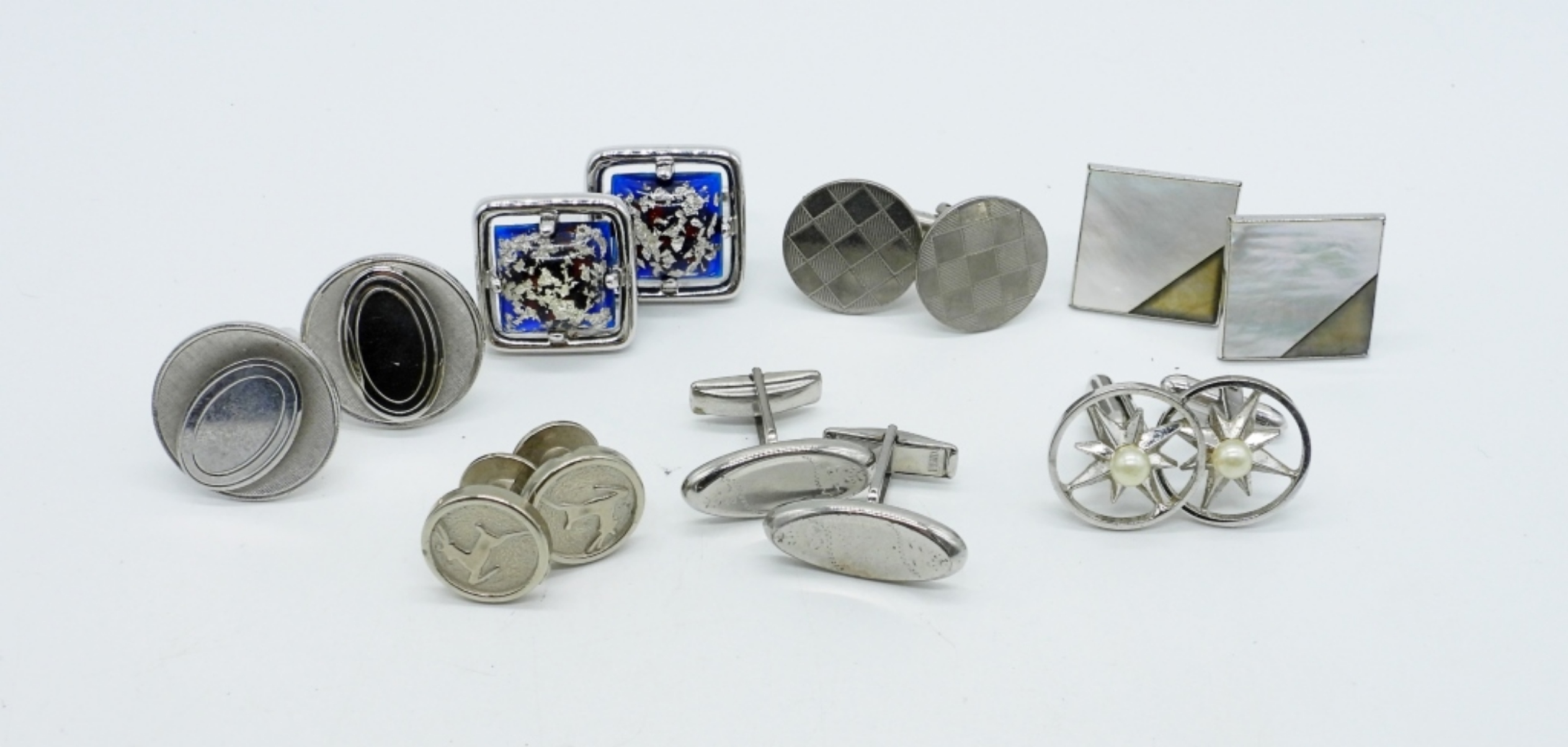 SEVEN PAIR OF VINTAGE SILVER TONE MEN’S CUFF LINKS.