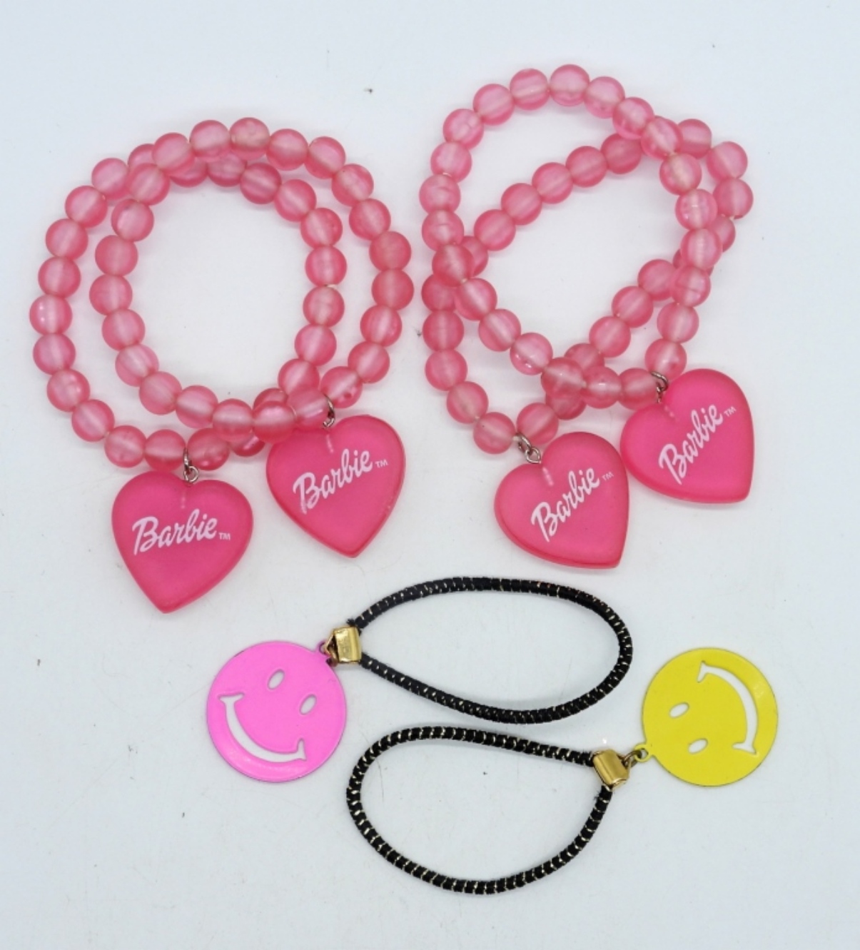 FOUR PINK BARBIE PLASTIC BRACELETS, TWO SMILEY FACE BRACELETS / HAIR ELASTICS.
