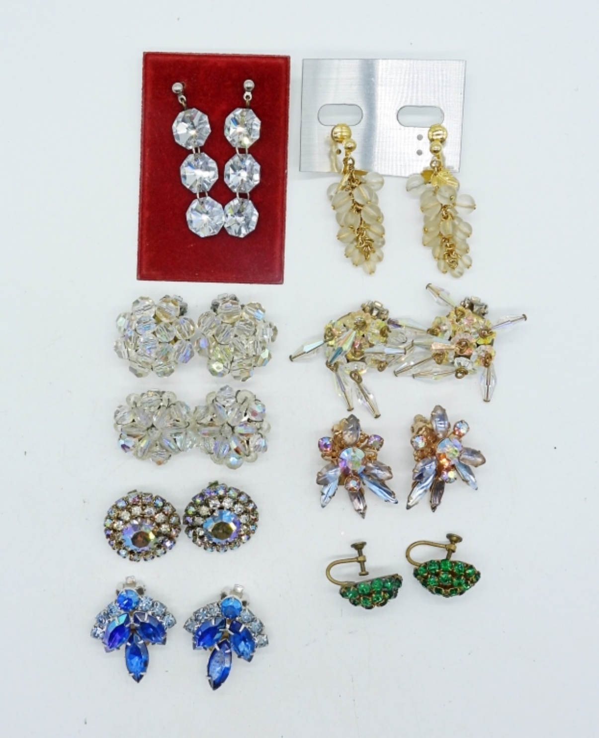 NINE PAIR OF VINTAGE RHINESTONE AND BEAD EARRINGS. ALL ARE CLIP ONS