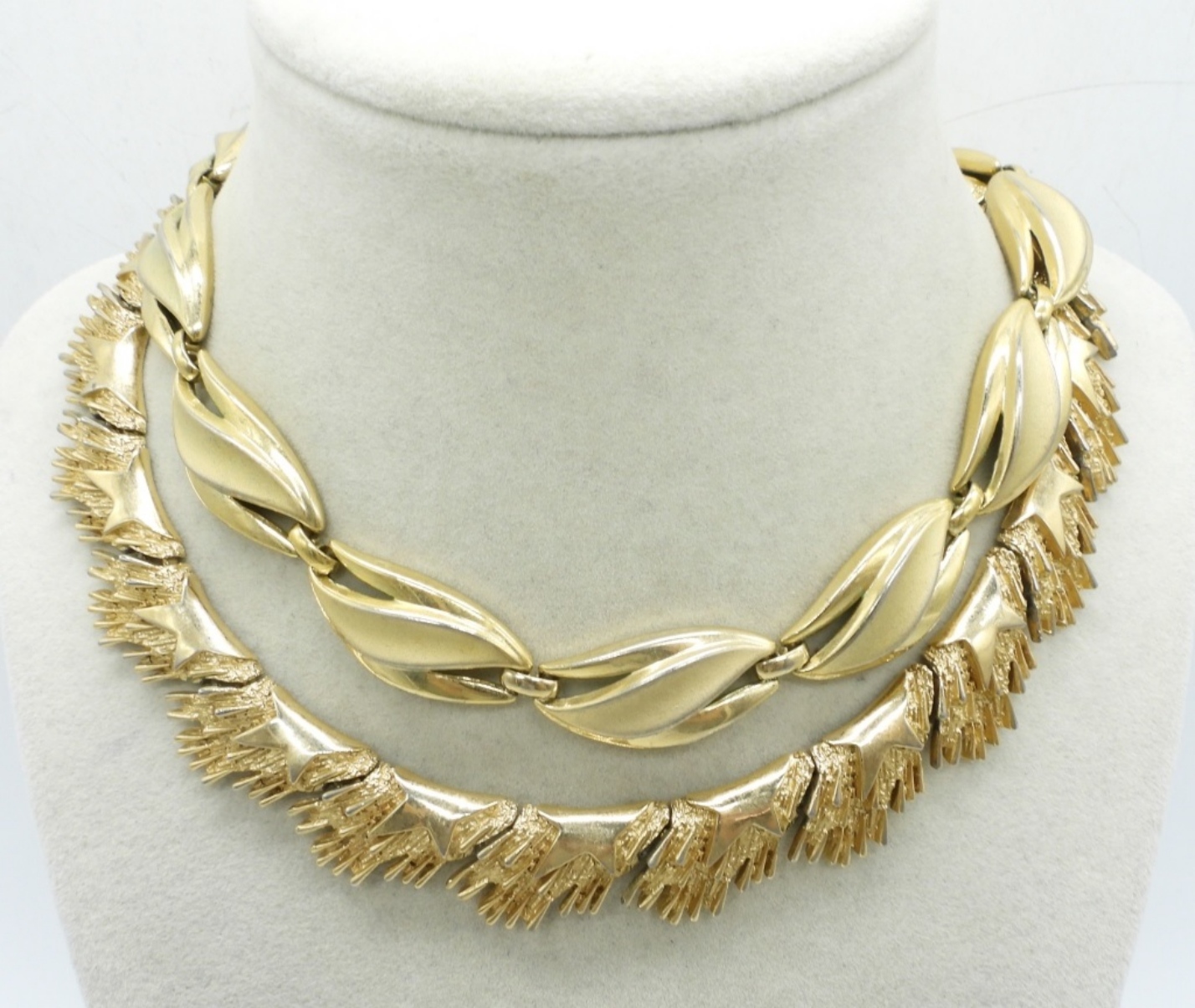 TWO GOLD TONE TRIFARI NECKLACES, 16″. TWO GOLD TONE VINTAGE NECKLACES 15 & 16″. TWO GOLD TONE BANGLE BRACELETS, ONE PAIR PIERCED EARRINGS AND A RING SIZE 8.
