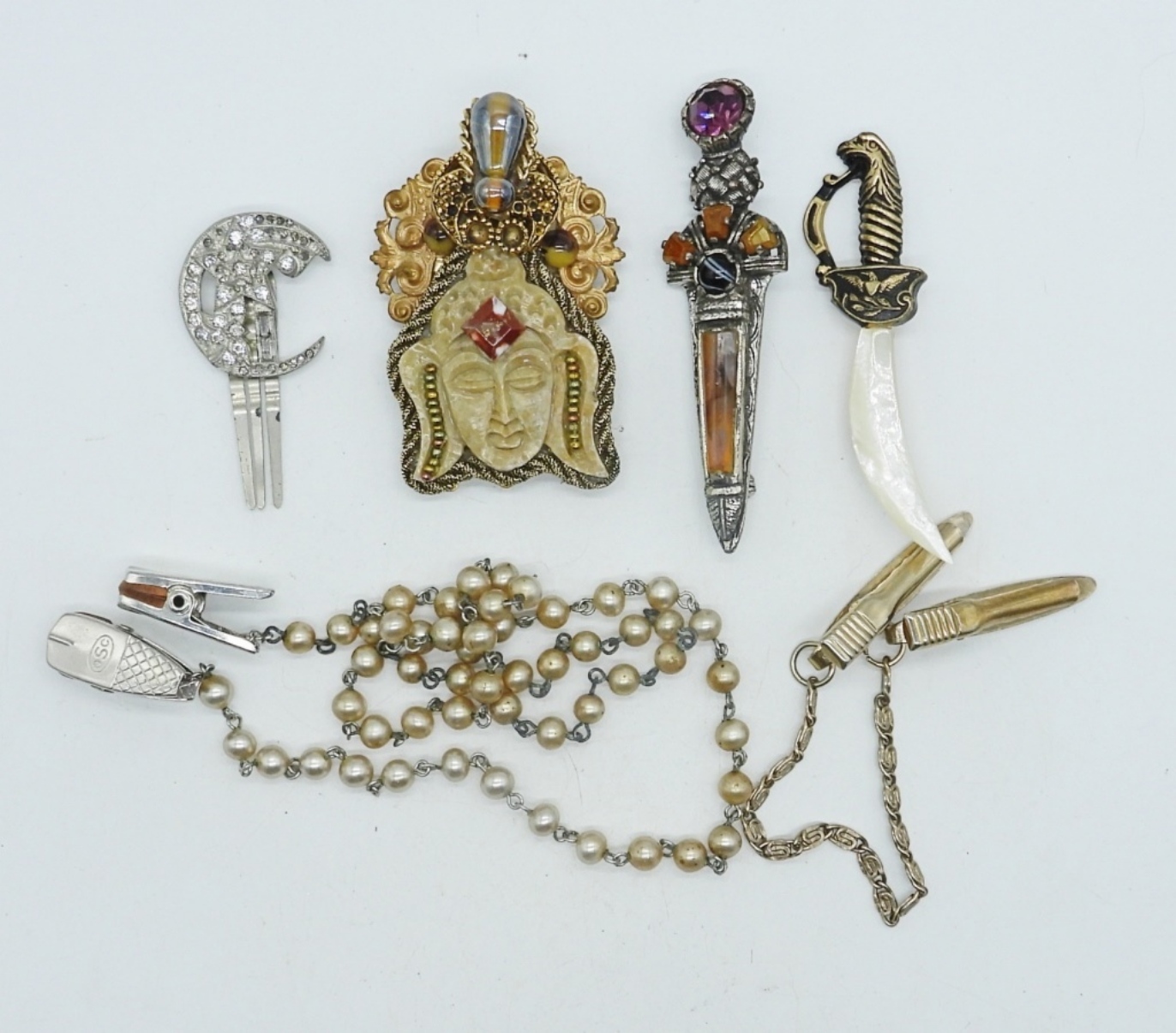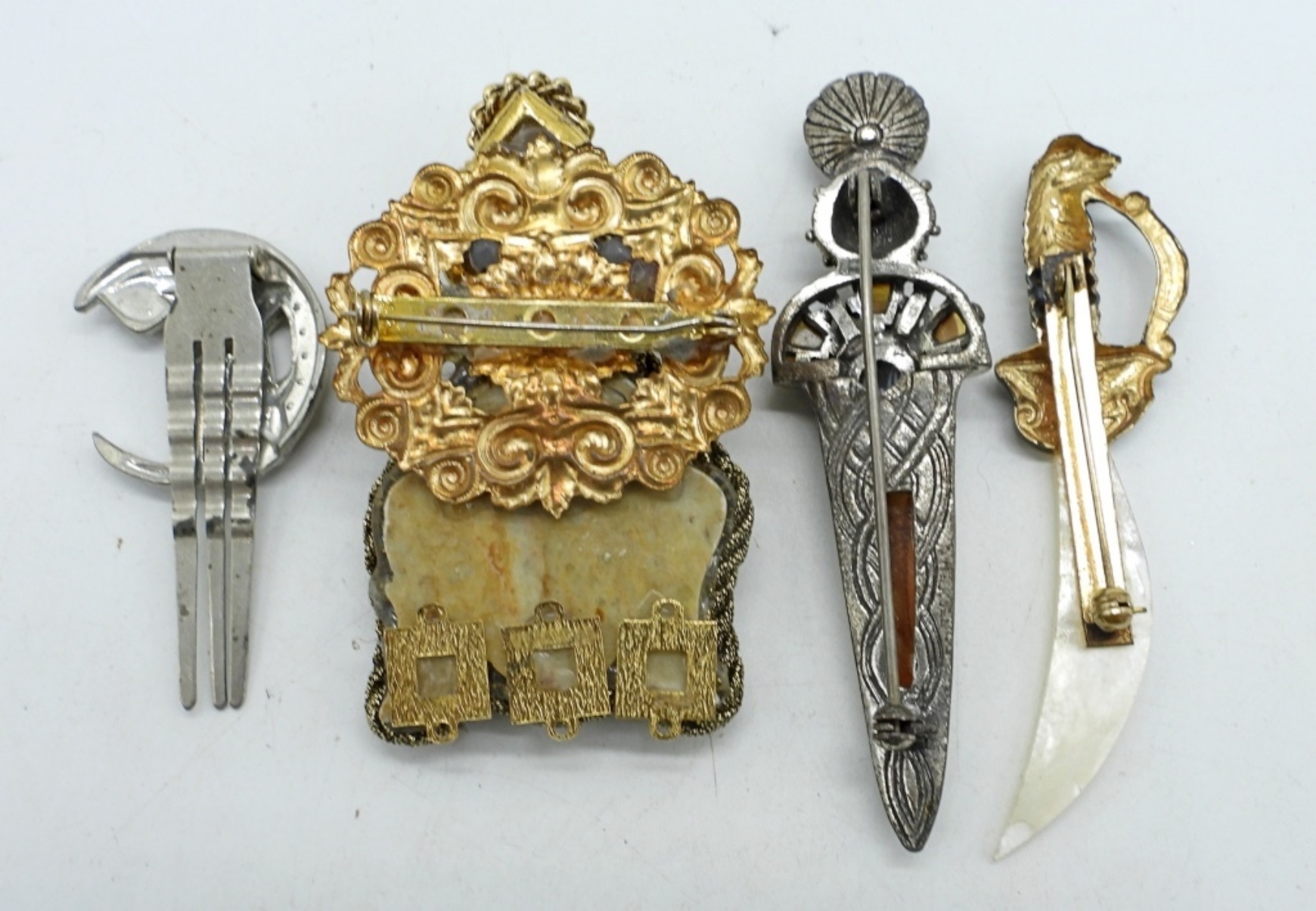 3 PINS, 3″ LONG. TWO SWEATER CLIPS, 8″ & 24″ . VINTAGE SILVER TONE CLIP, 2″.