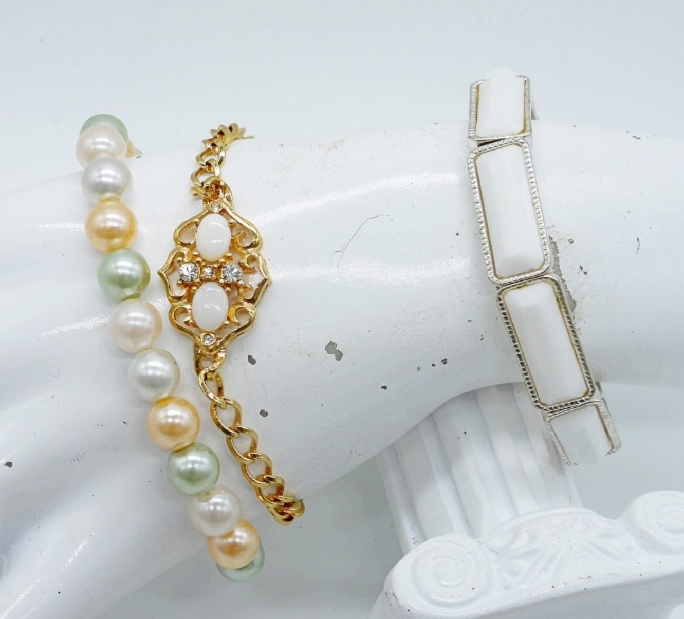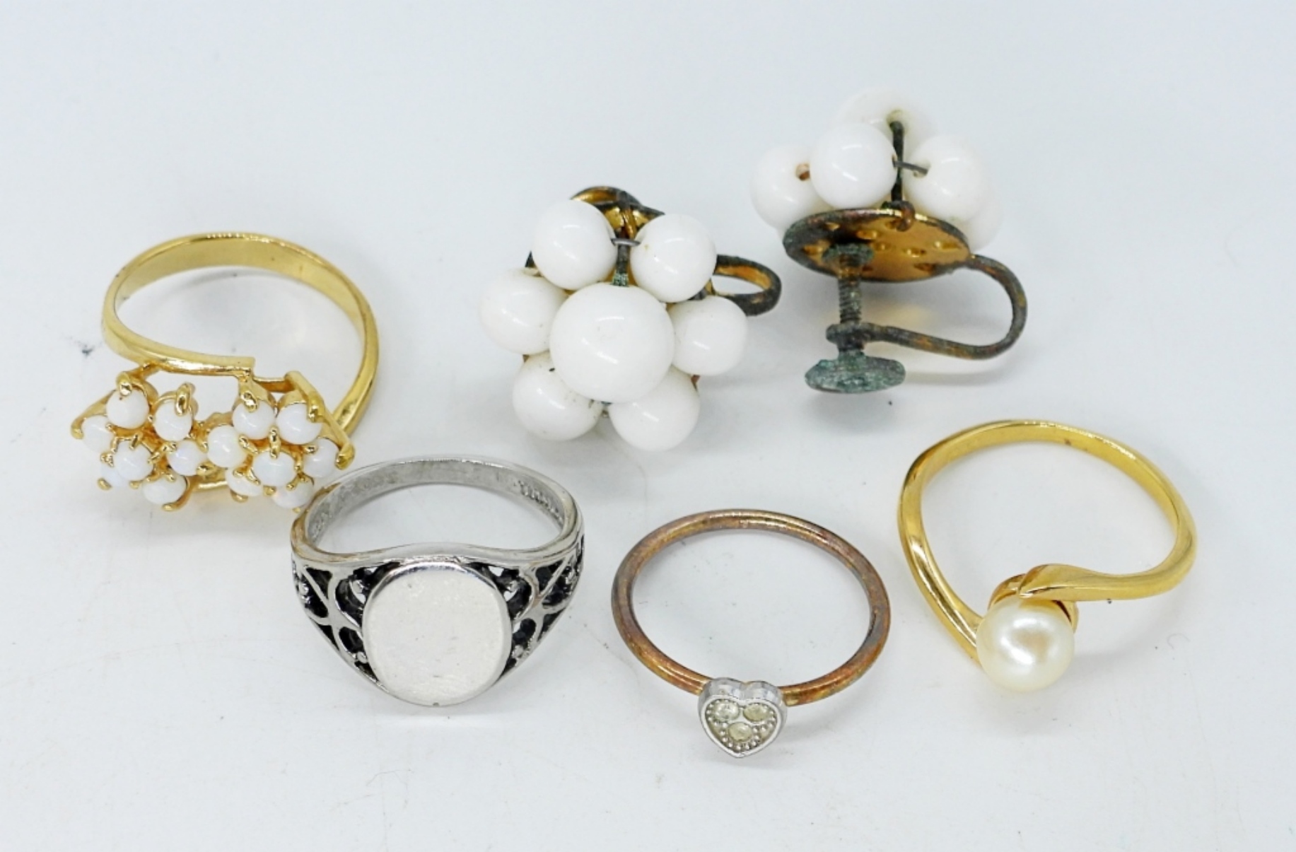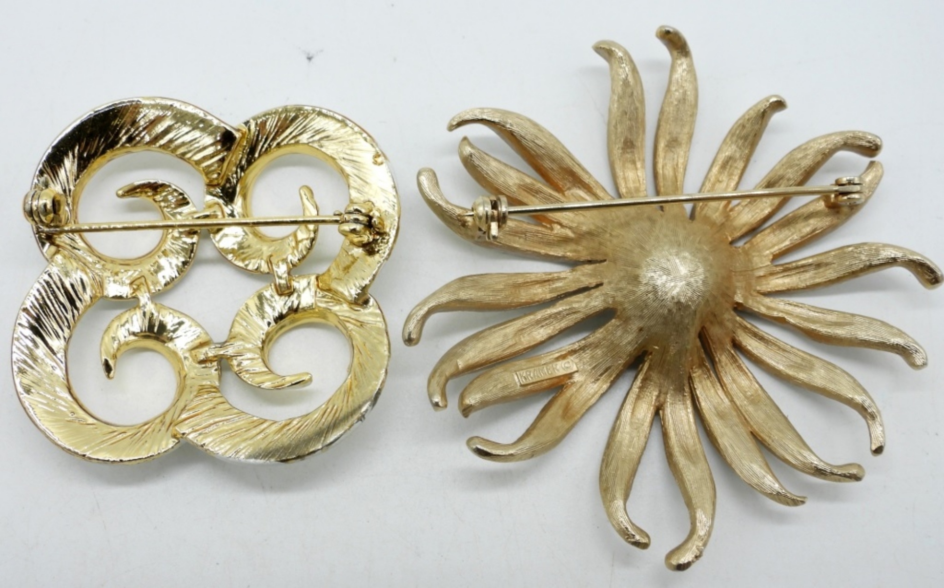 TWO BROOCHES, ONE KRAMER FLOWER BROOCH, 2.5″. FOUR RINGS, SIZES 4, 5, 6. ONE PAIR SCREW BACK EARRINGS. THREE BRACELETS, 7-8″.