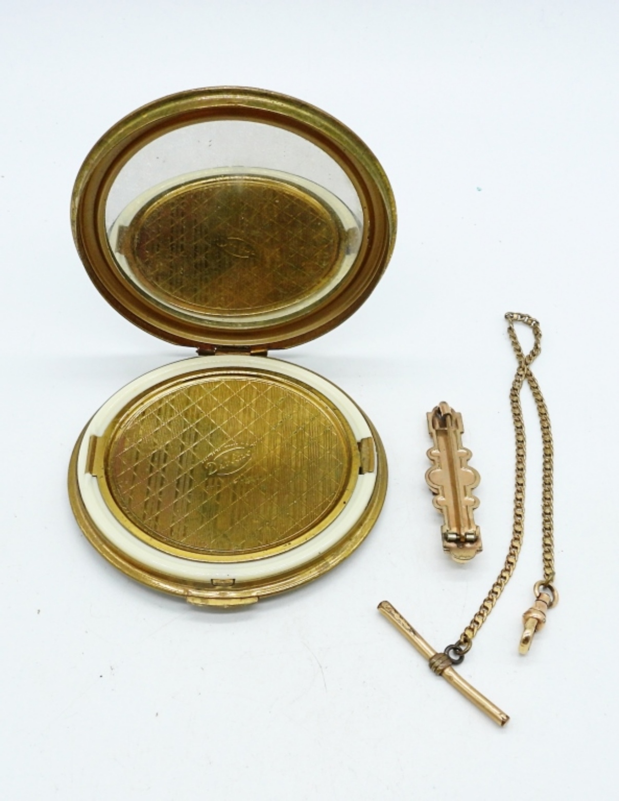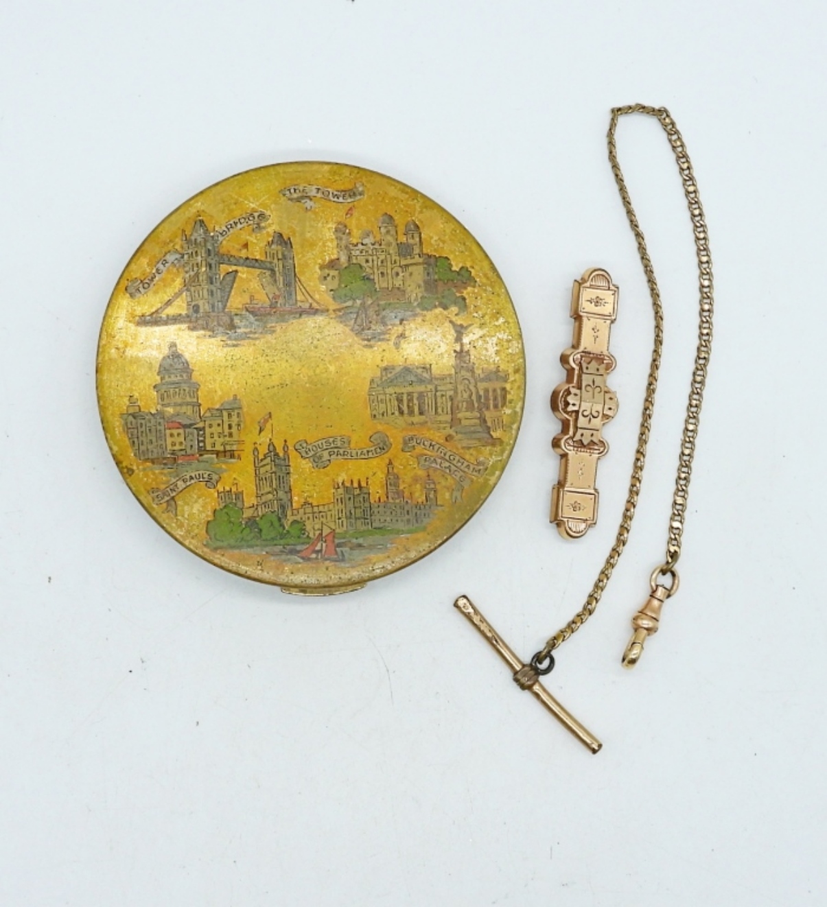 ONE VINTAGE 1940’s/1950’s BRASS POWDER COMPACT WITH A LONDON SCENE (FADING / CHIPPING).INSIDE IS CLEAN AND SEEMINGLY UNUSED. 3″. ANTIQUE ROSE GOLD TONE WATCH CHAIN AND PIN. CHAIN IS 9″.