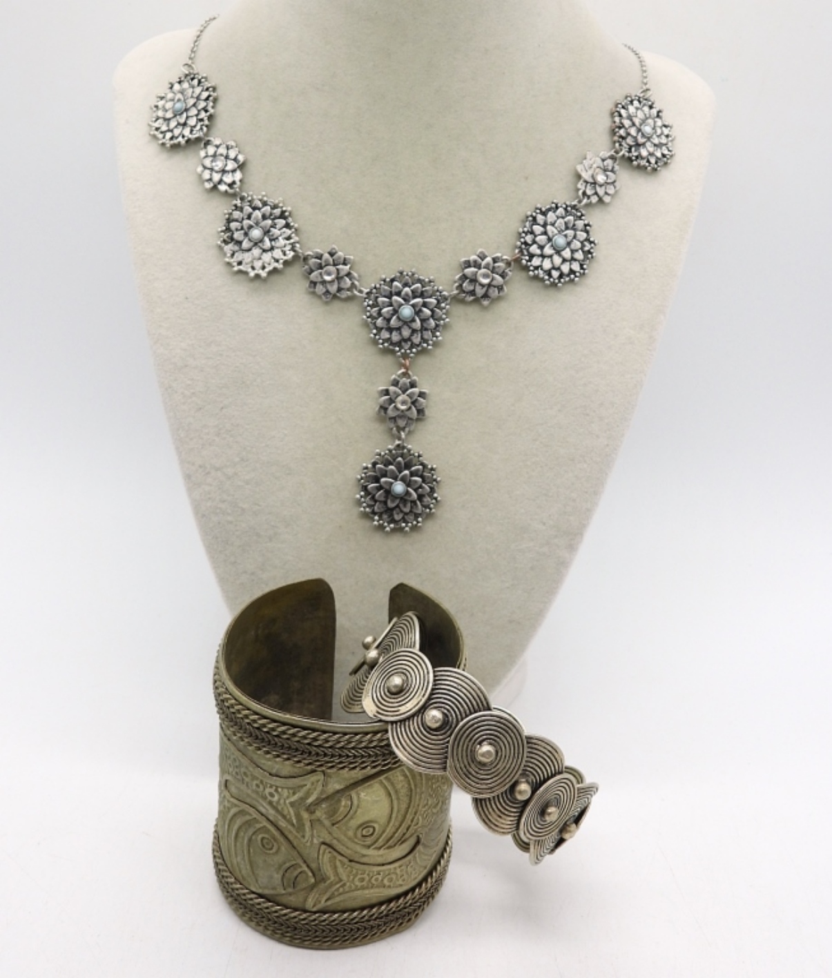 3″ LONG FISH MOTIF CUFF BRACELET. CIRCLES BRACELET. NECKLACE 18″.