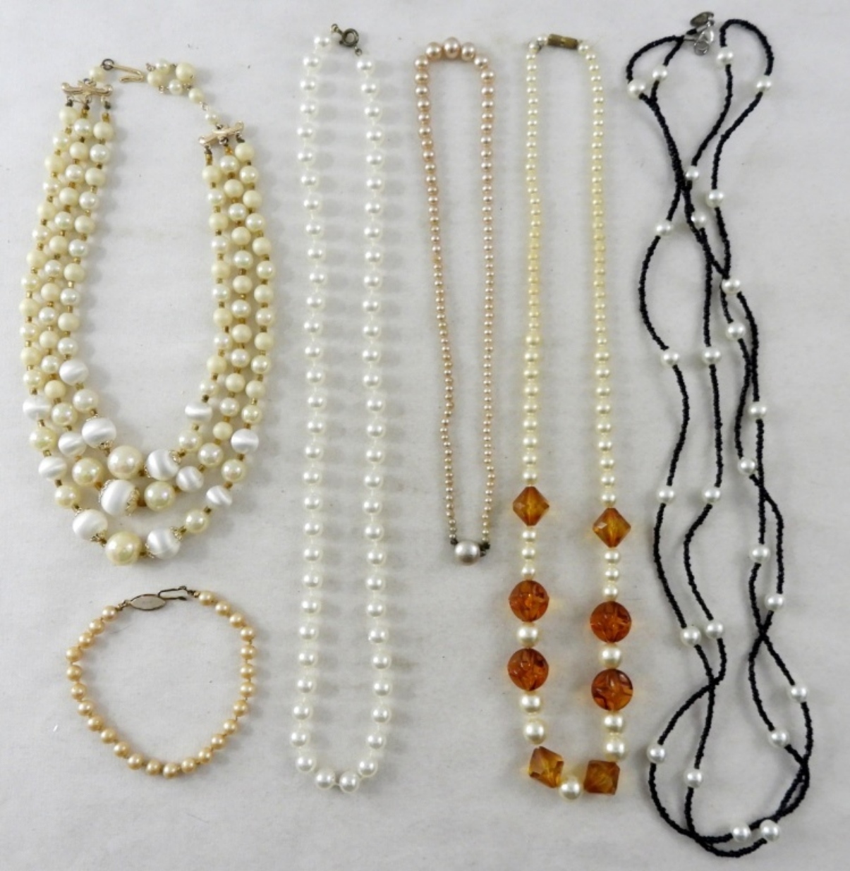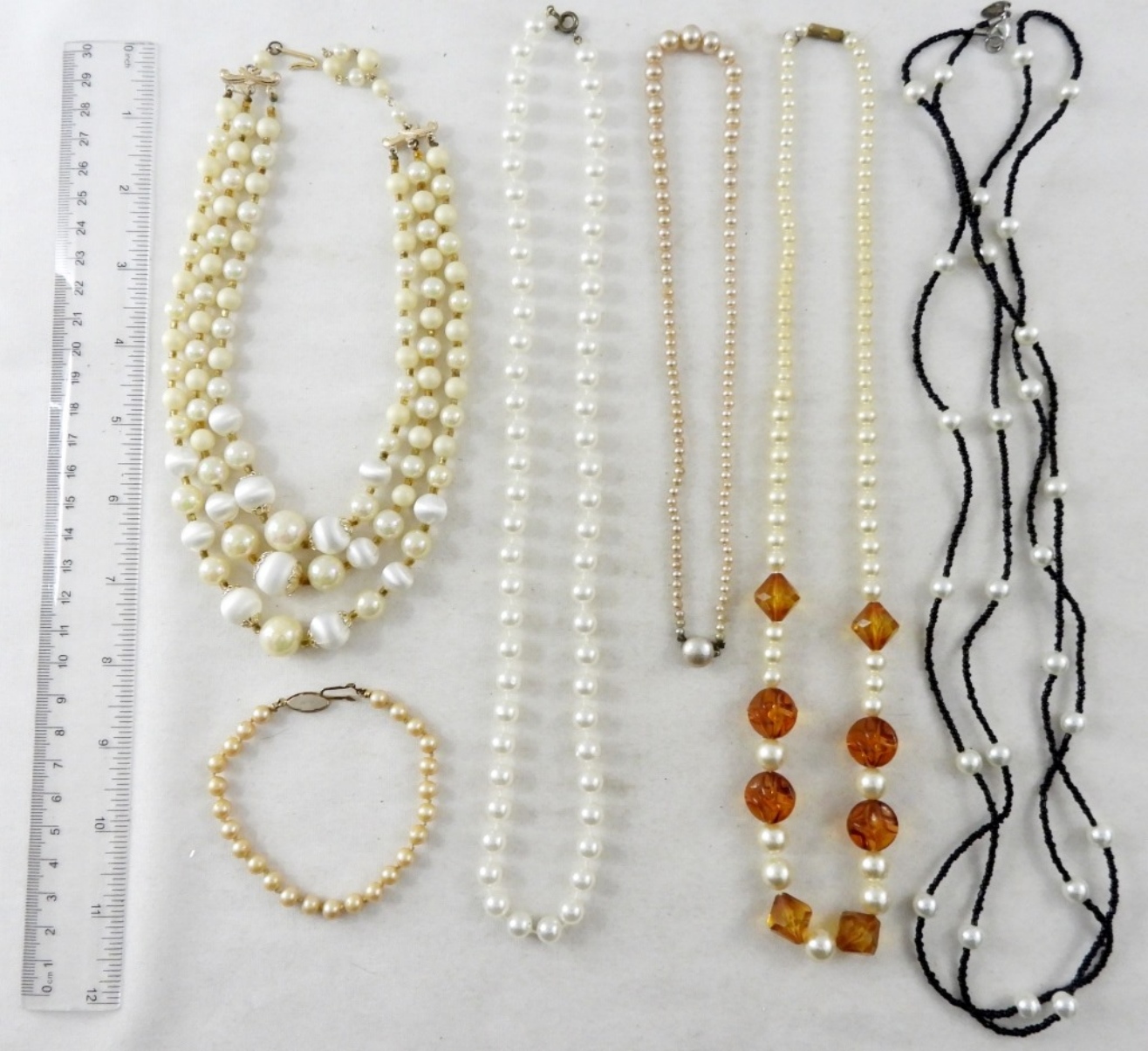 MIXED LOT OF BEADED NECKLACES, WITH A BEADED BRACELET. ALL IN GOOD CONDITION.