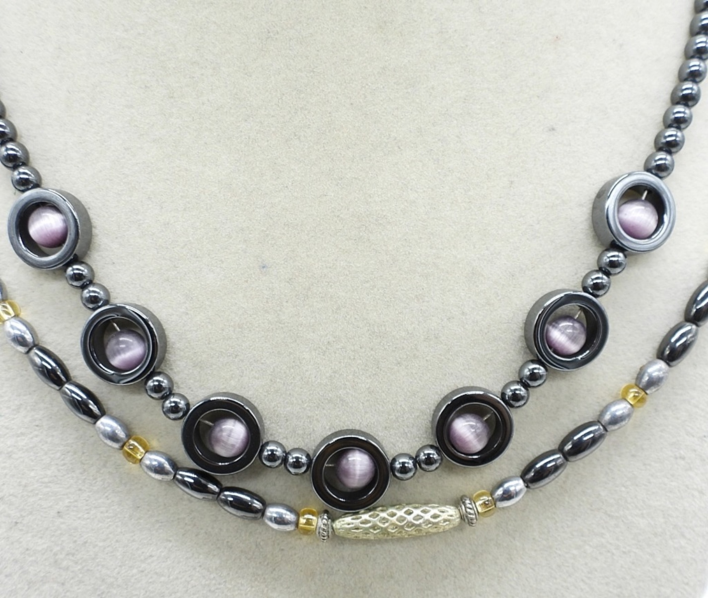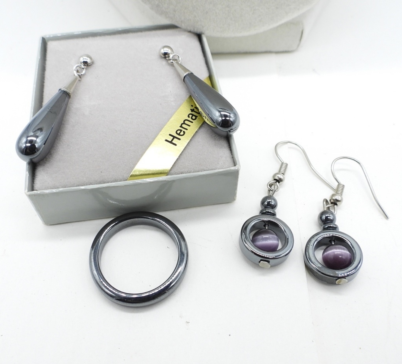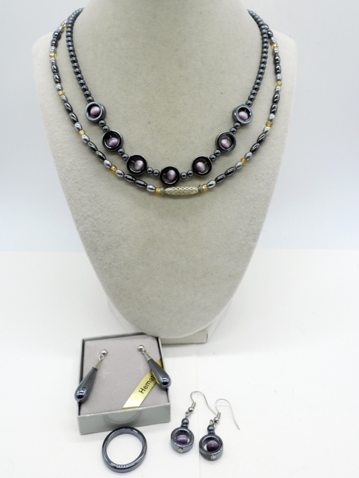 TWO HEMATITE NECKLACES, 18″ & 17″. RING SIZE 7. TWO PAIR OF PIERCED HEMATITE EARRINGS.