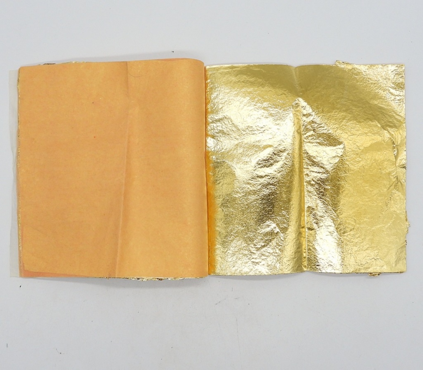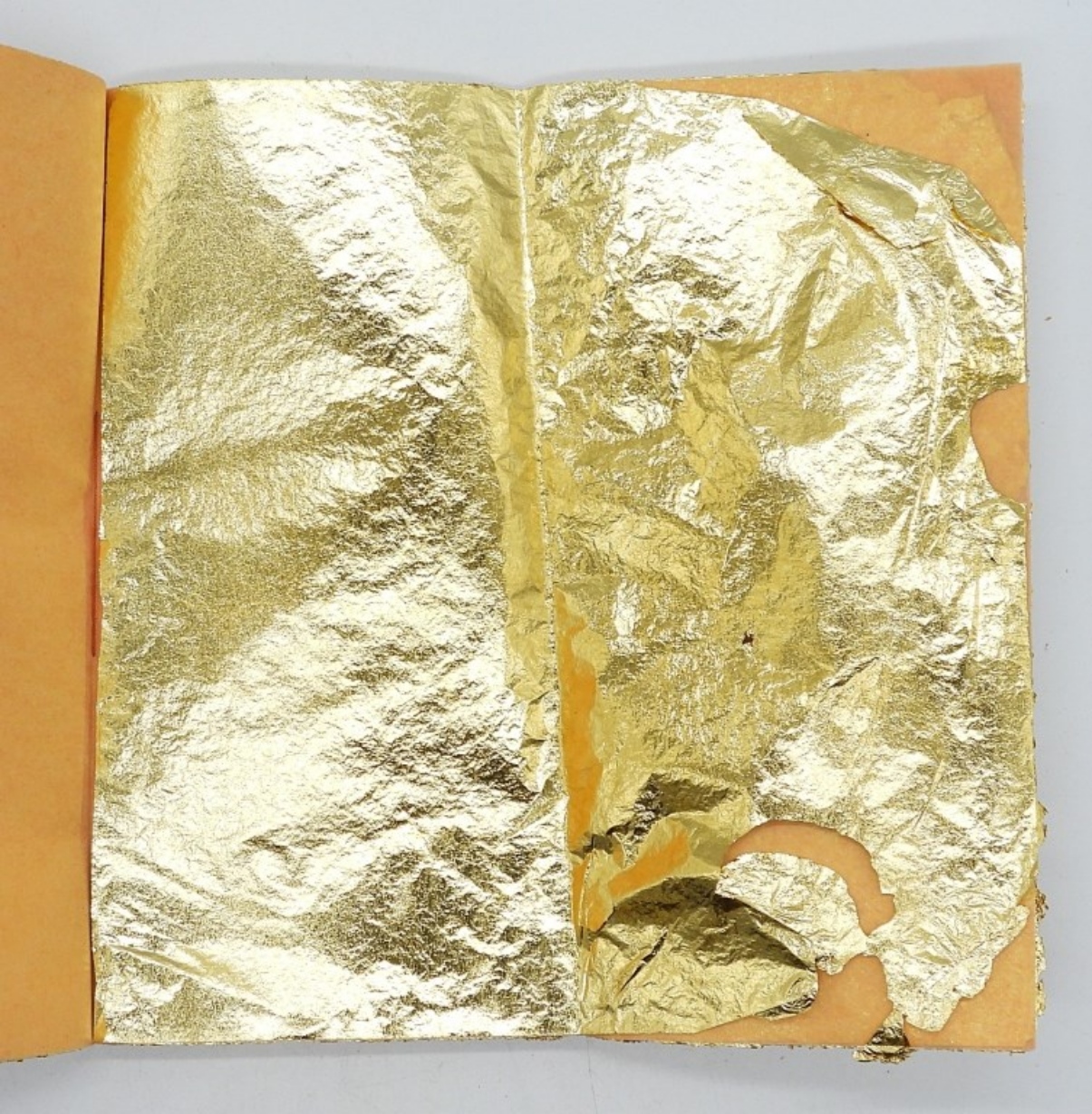 APPROXIMATELY 15 SHEETS OF GOLD LEAF (IT IS NOT GOLD, ONLY GOLD IN COLOR. HAS BEEN TESTED AND IS COPPER). NOT ALL OF THE SHEETS ARE FULL SHEETS. SOME OF THEM ARE TORN OR MISSING PIECES. SHEETS ARE APPROX 5.5″ BY 5.5″.