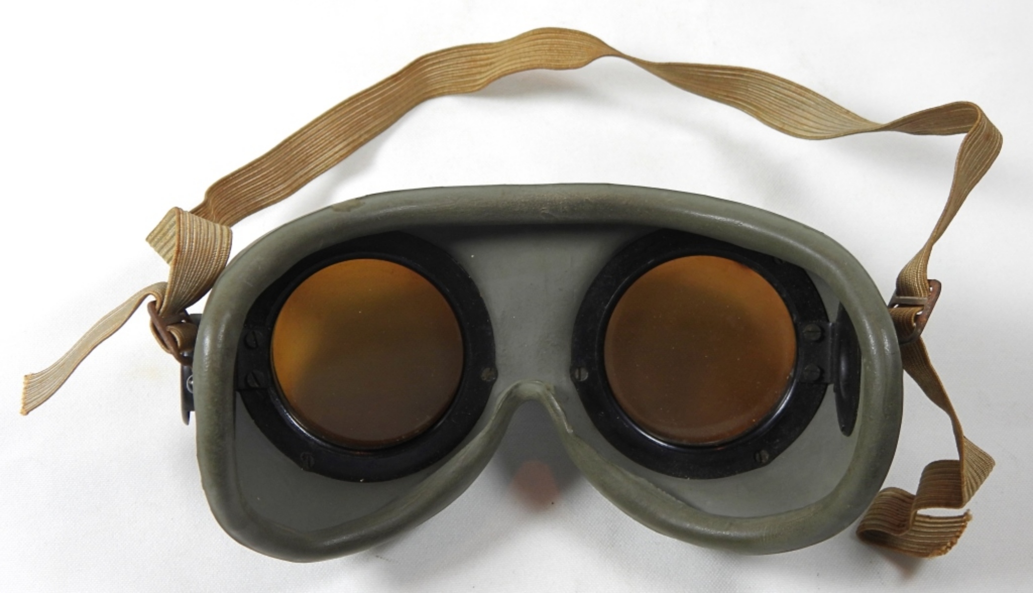 1 PAIR OF VINTAGE MILITARY EYE GOGGLES, STRAP STILL CONNECTED