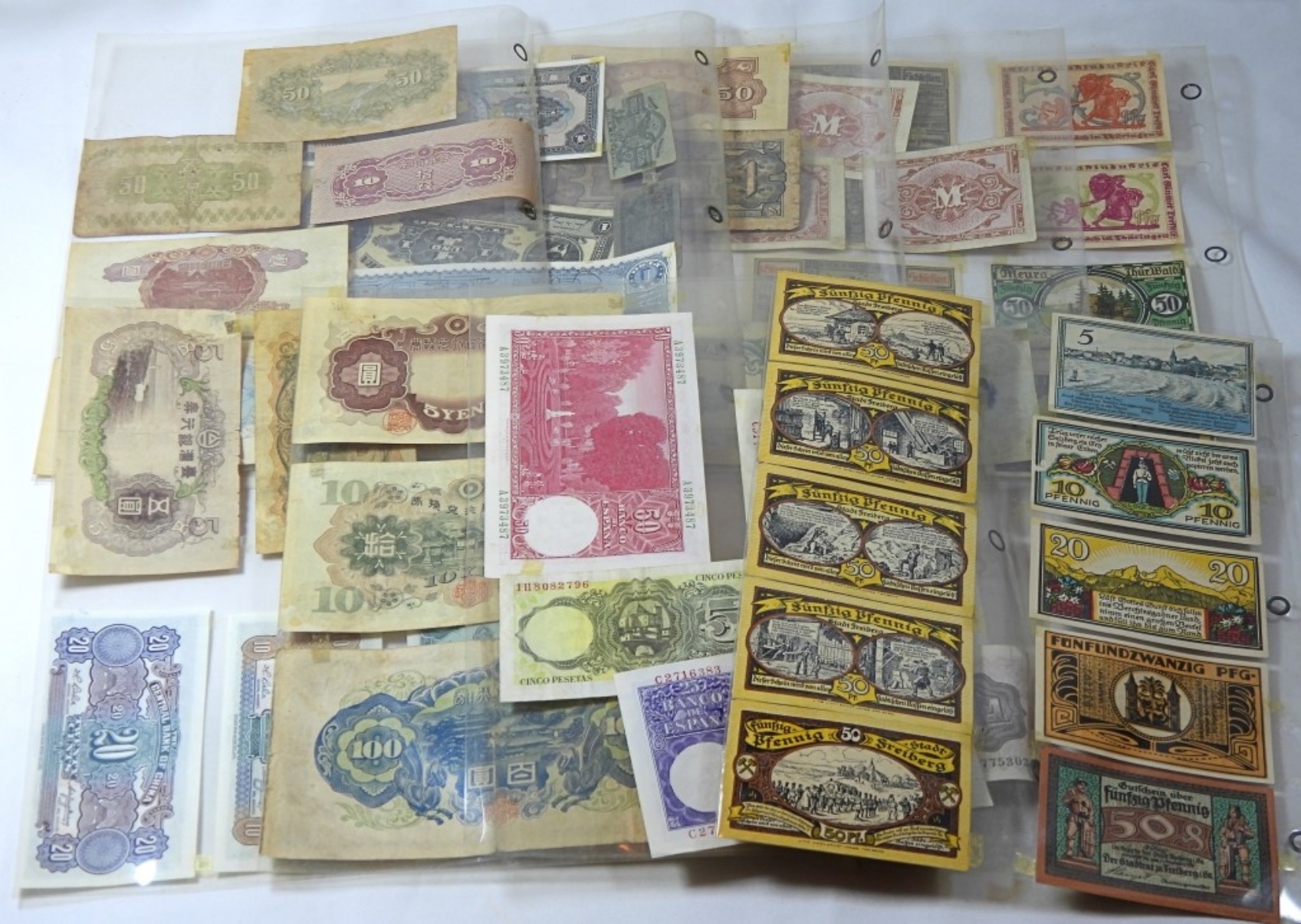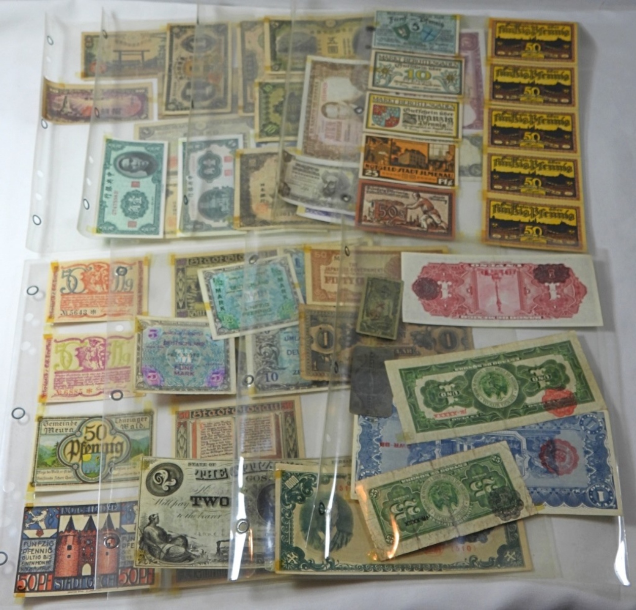 9 SHEETS OF VINTAGE FOREIGN CURRENCY, 50 FOREIGN NOTES TOTAL