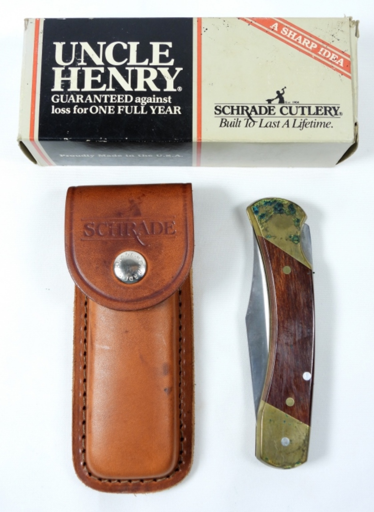 SCHRADE LB7 UNCLE HENRY FOLDABLE KNIFE WITH SHEATH AND ORIGINAL BOX, SOME WEAR ON BACK OF THE KNIFE AND INSIDE OF SHEATH
