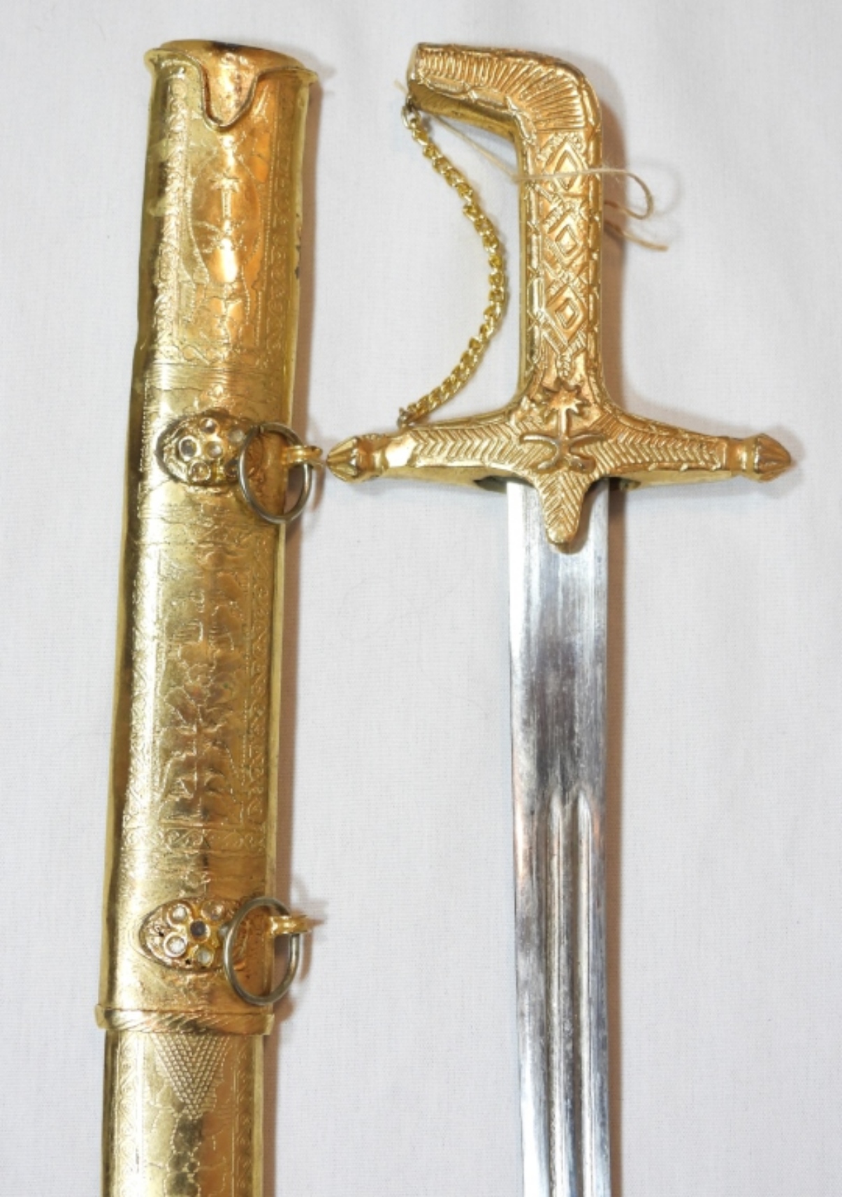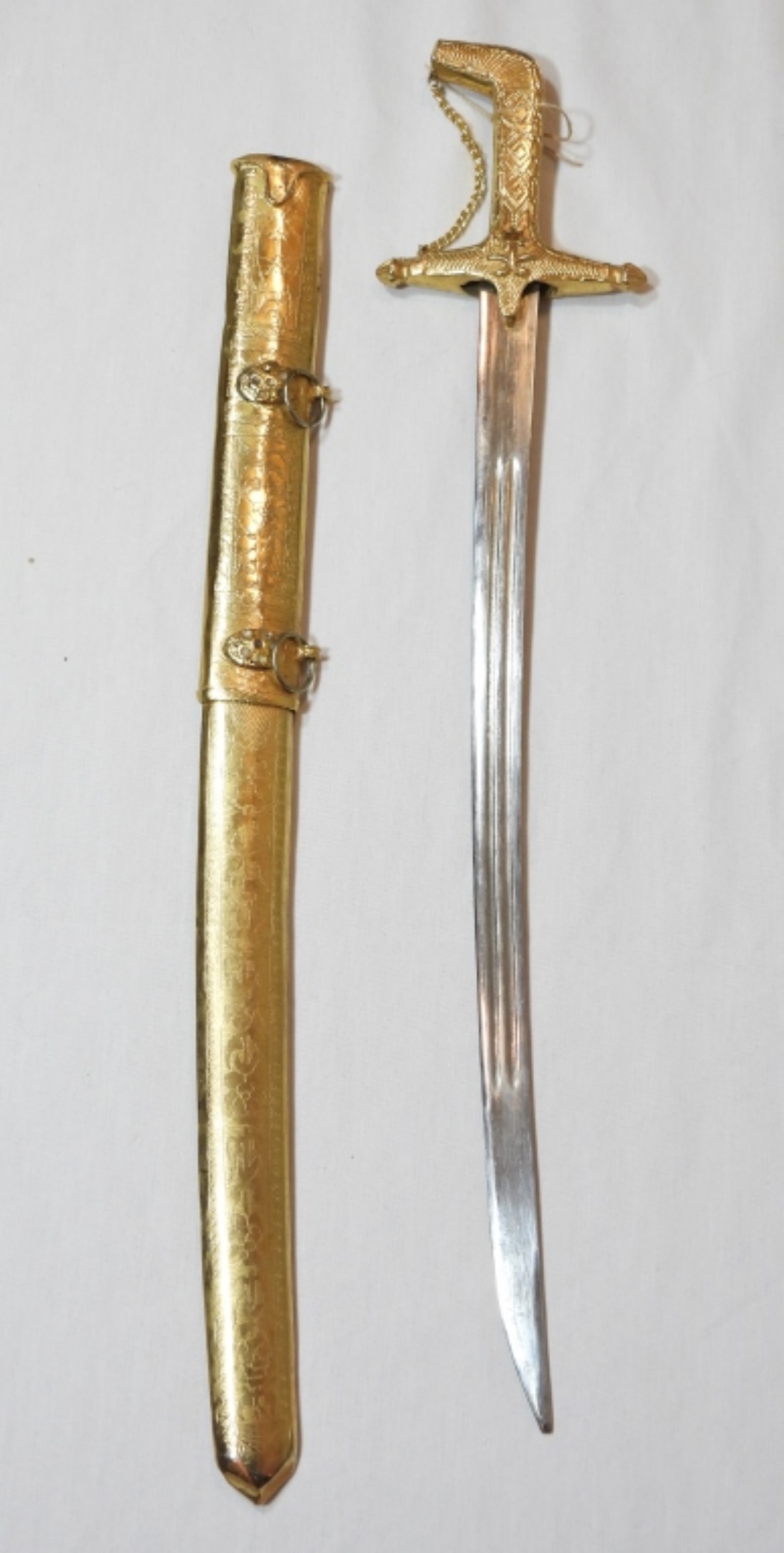 JAPANESE COLLECTIBLE GOLD TONE SWORD, WITH ORIGINAL SWORD COVER, SOME GEMSTONES MISSING ON THE SWORD COVER