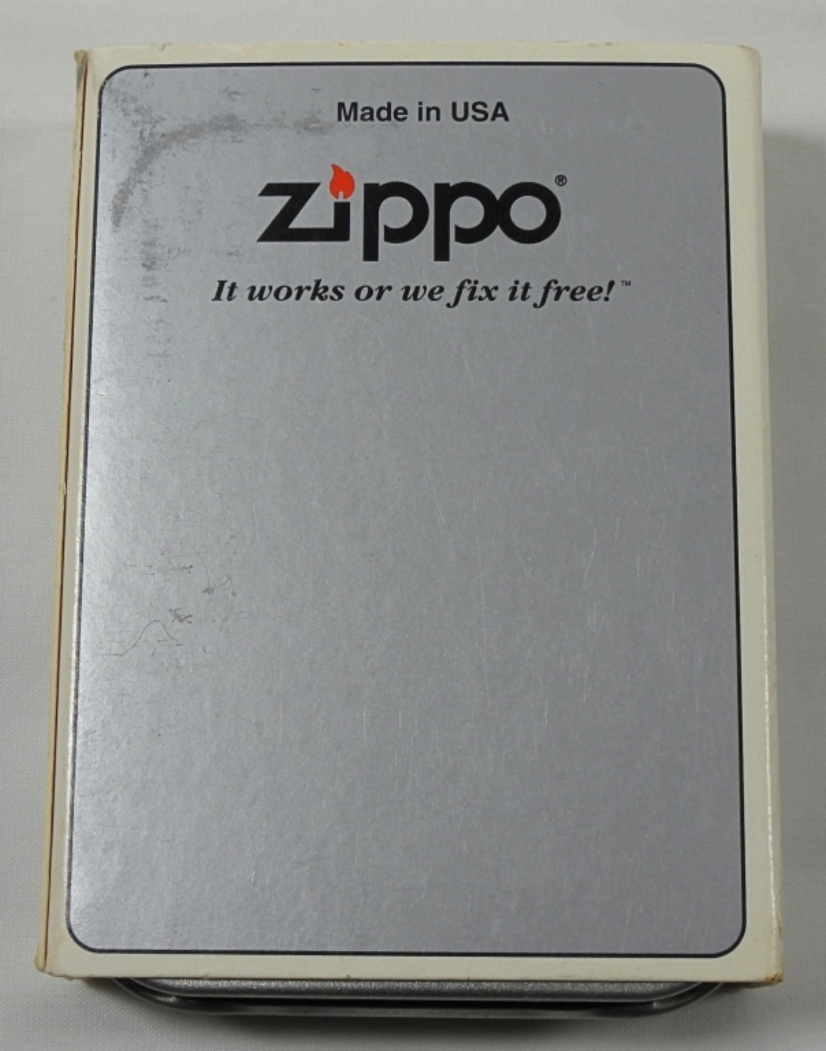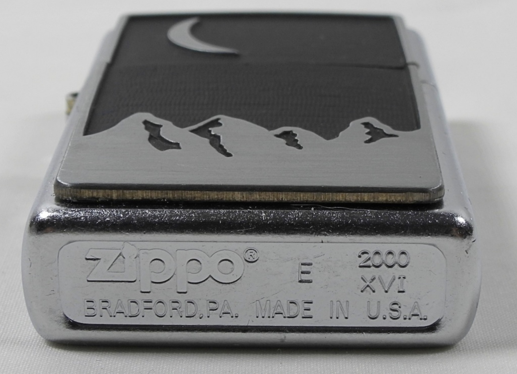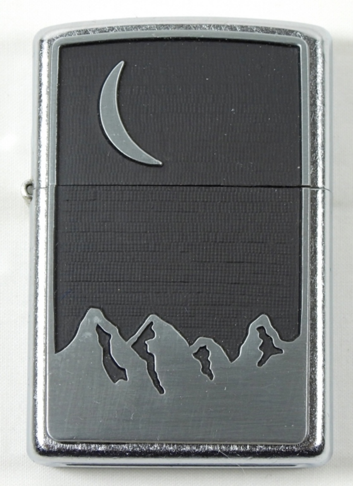 2000 SILVER CHROME WITH BLACK MATTE MOON OVER MOUNTAINS SEALED ZIPPO IN TIN