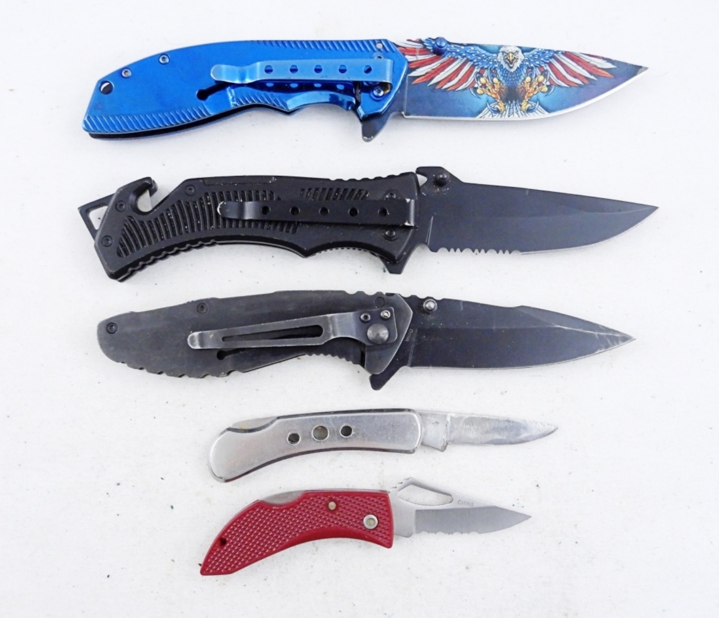 BLUE AMERICAN FLAG UTILITY KNIFE IN GOOD CONDITION, 2 SMALL UTILITY KNIVES, 1 DIGITAL CAMO UTILITY KNIFE IN GOOD CONDITION, 1 BLACK UTILITY KNIFE IN GOOD CONDITION. ALL PRE OWNED.