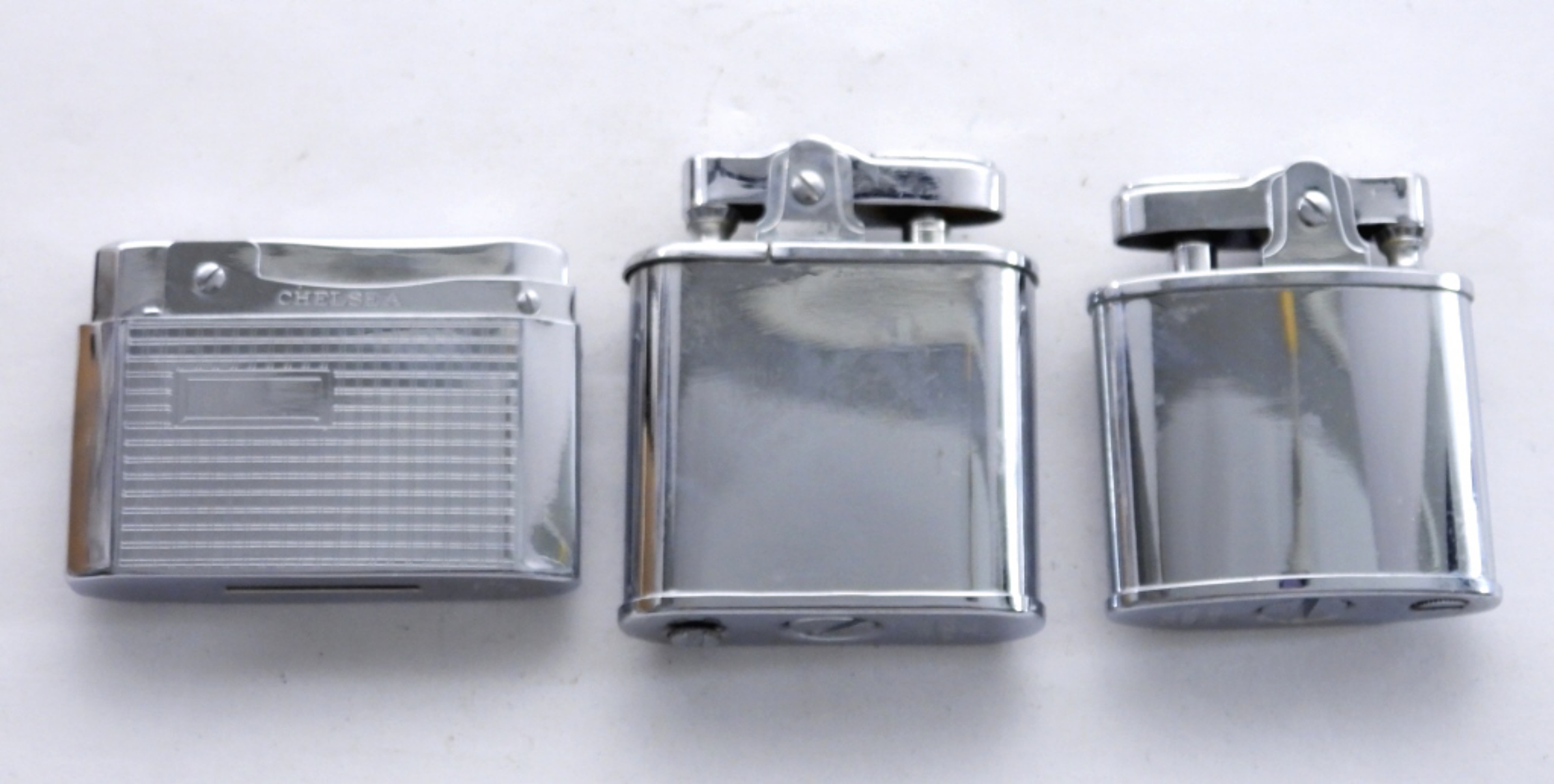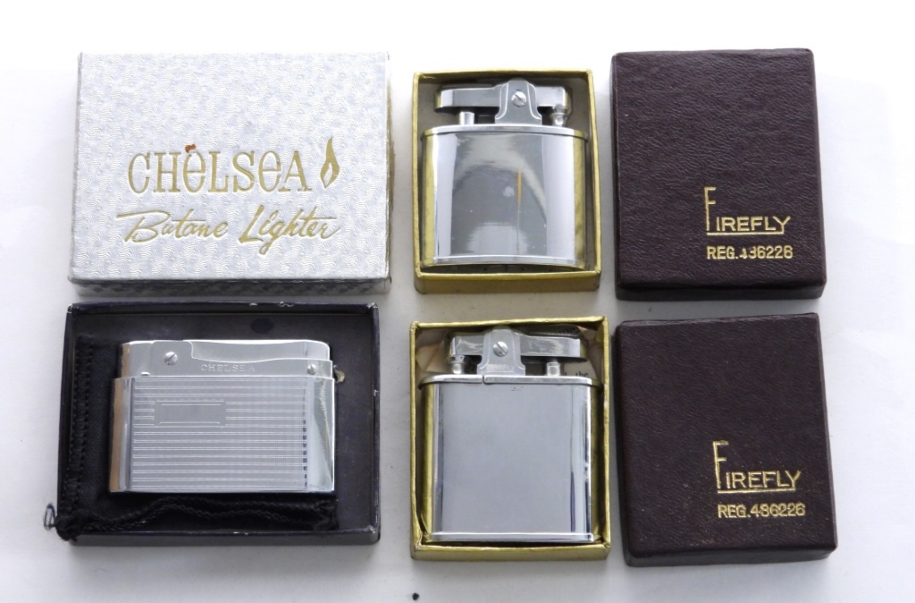 3- VINTAGE HAND HELD LIGHTERS- 2 FIREFLY HAND HELD LIGHTERS -(UNFIRED). CHELSEA BUTANE LIGHTER- SILVER TONE- FIRED. IN GOOD CONDITION, ALL OF THESE LIGHTERS DO SHOW WEAR, PREOWNED. BRANDS ARE UNSEARCHED AND