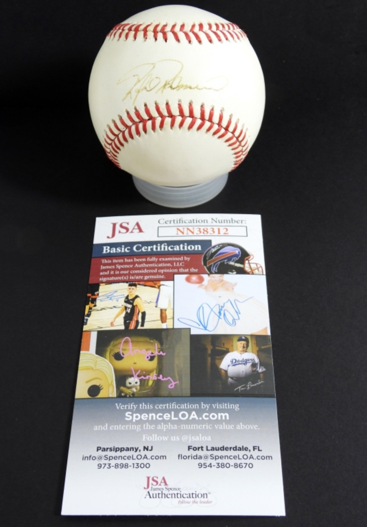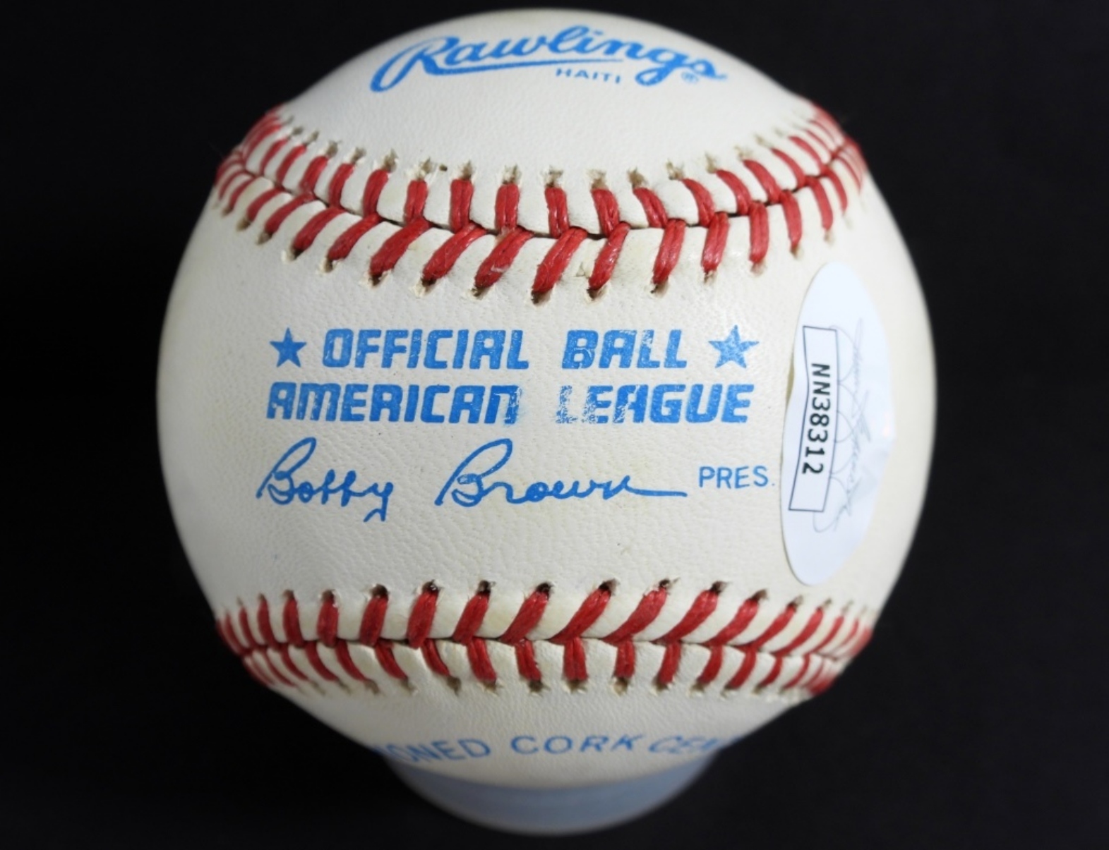 OFFICIAL AMERICAN LEAGUE AUTOGRAPHED BASEBALL BY RAFAEL PALMEIRO WITH JSA COA- IN GOOD CONDITION- PREOWNED.