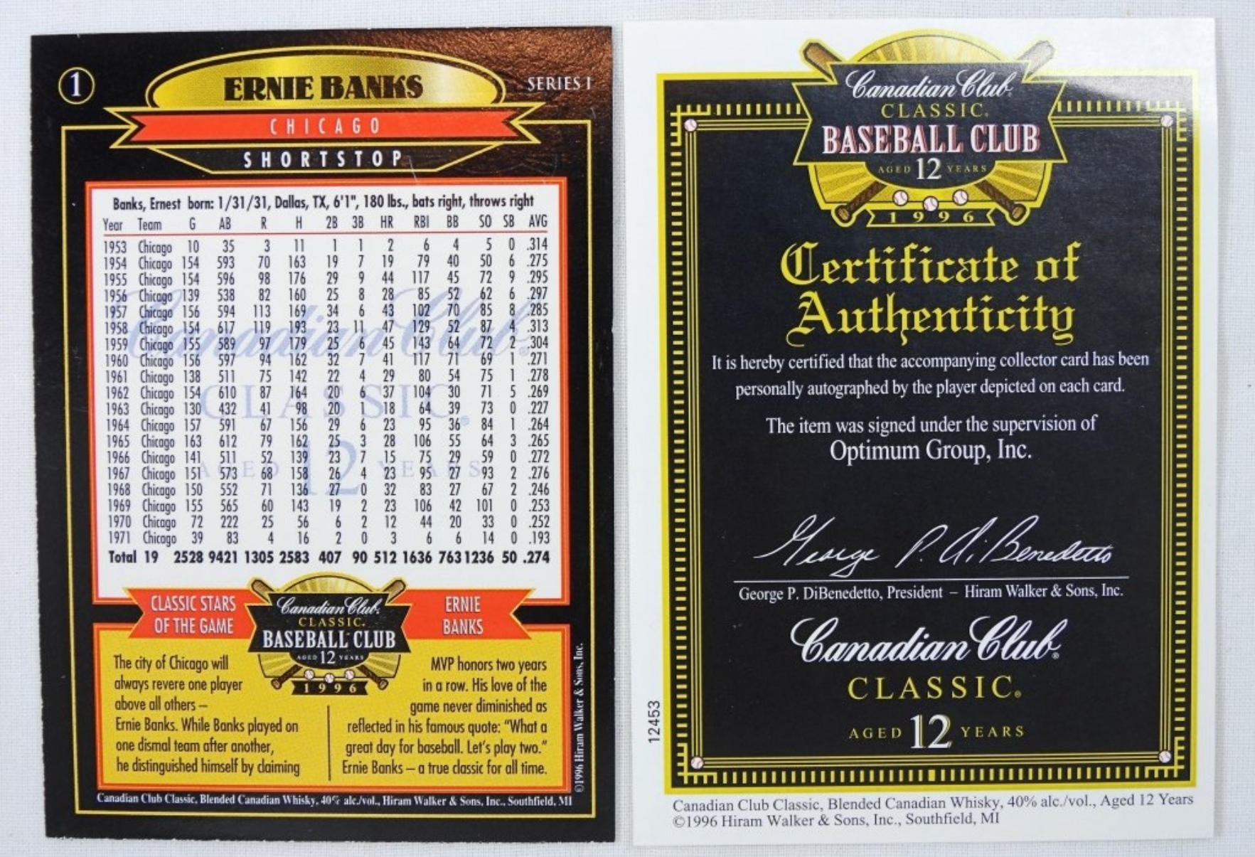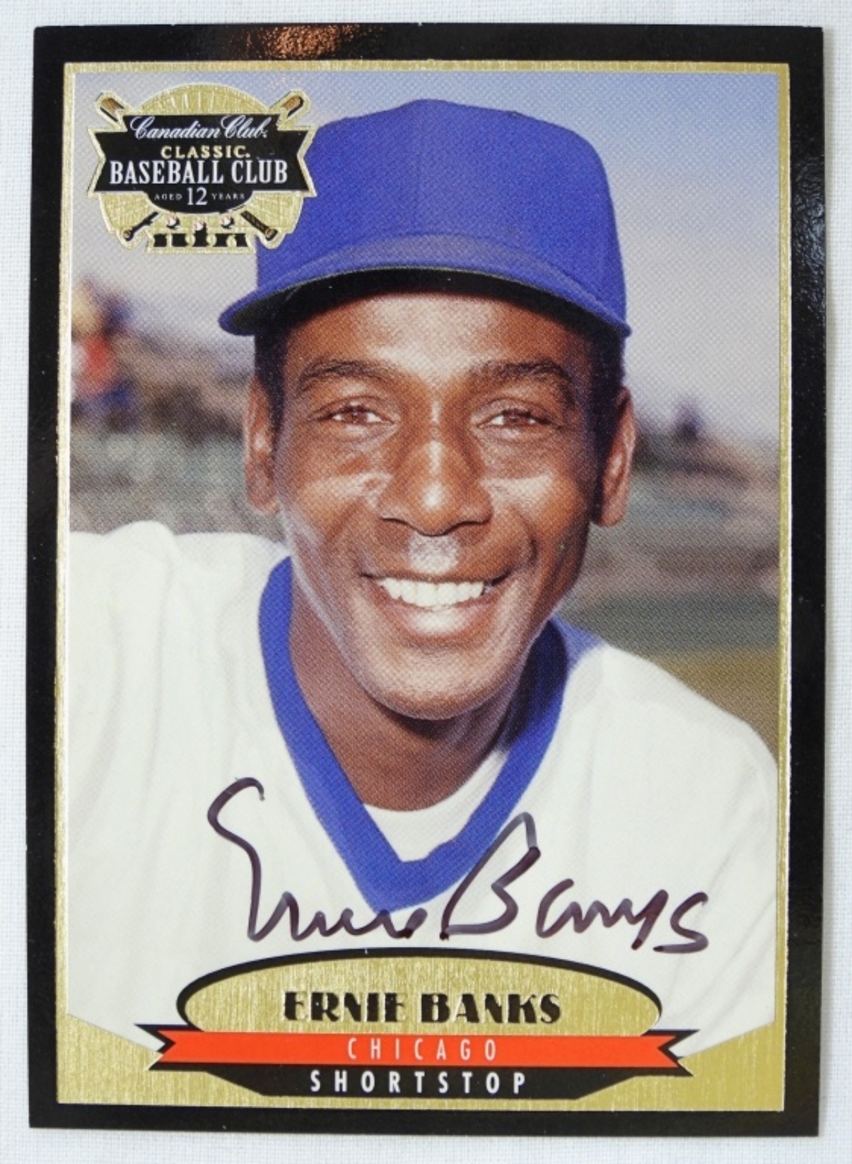 EARNIE BANKS SIGNED CANADIAN CLUB CARD, WITH COA BY CANADIAN CLUB