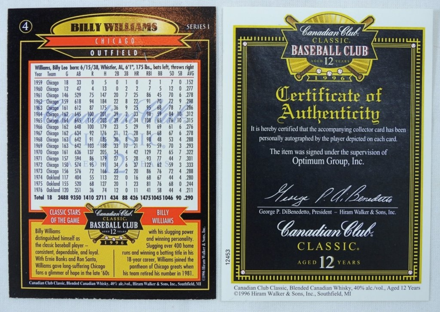 BILLY WILLIAMS SIGNED CANADIAN CLUB CARD, WITH COA BY CANADIAN CLUB