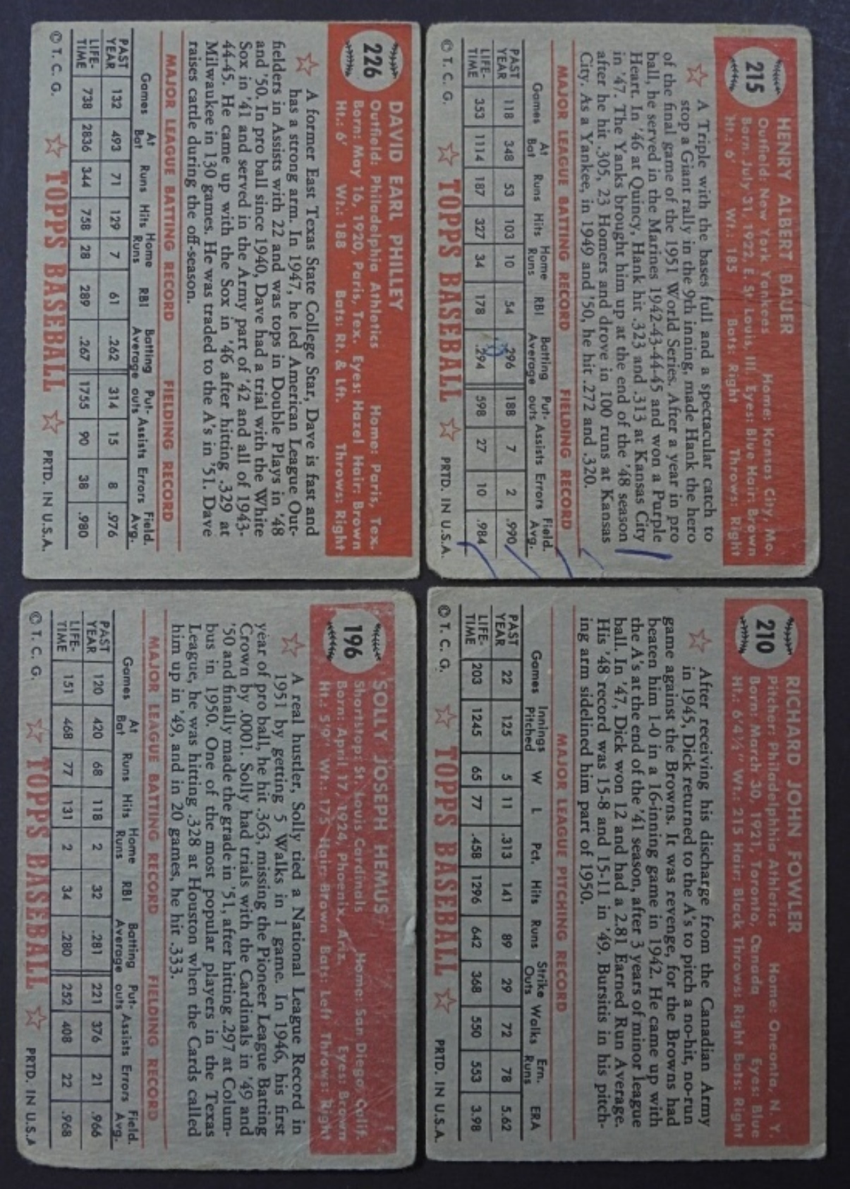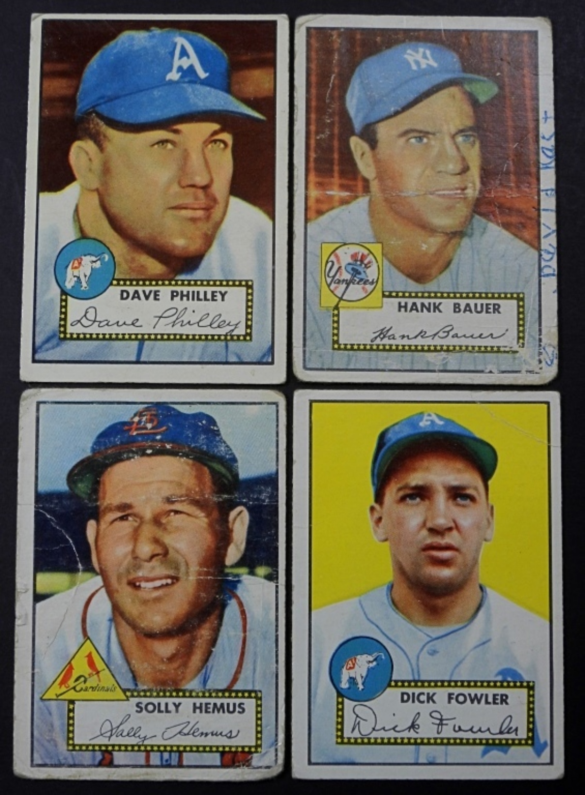 4 1952 TOPPS BASEBALL CARDS, PLAYERS (SOLLY HEMUS, DICK FOWLER, HANK BAUER, DAVE PHILLEY), CONDITION VG-VGEX OVERALL