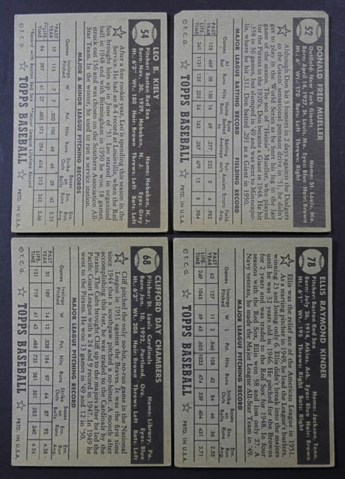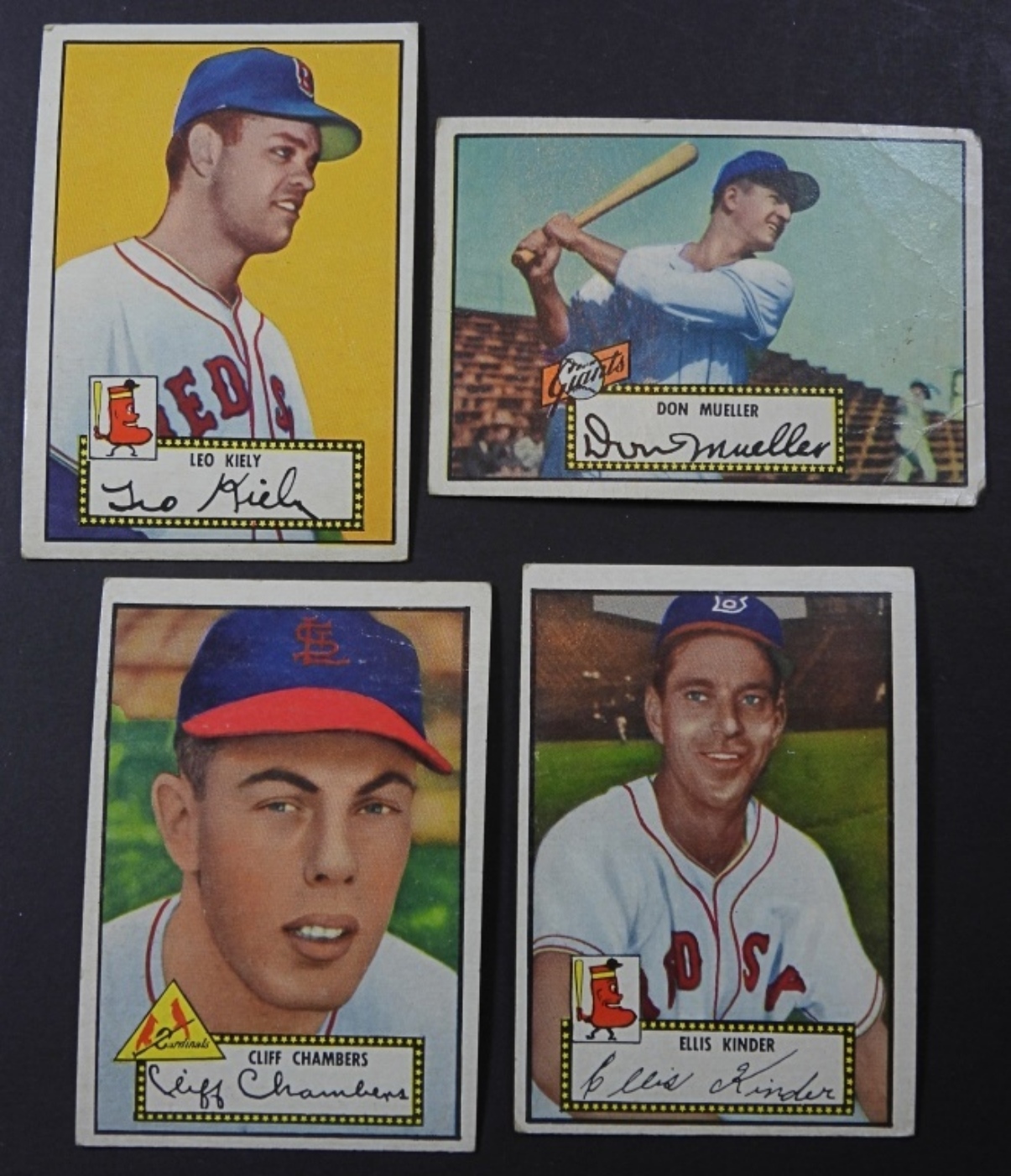 4 1952 TOPPS BASEBALL CARDS, PLAYERS (LEO KIELY, ELLIS KINDER, CLIFF CHAMBERS, DON MUELLER), CONDITION VG-VGEX OVERALL