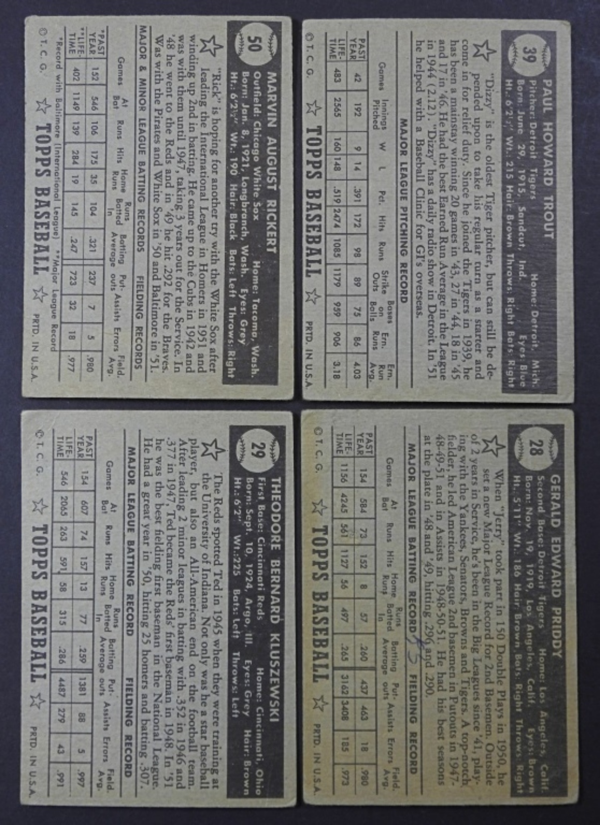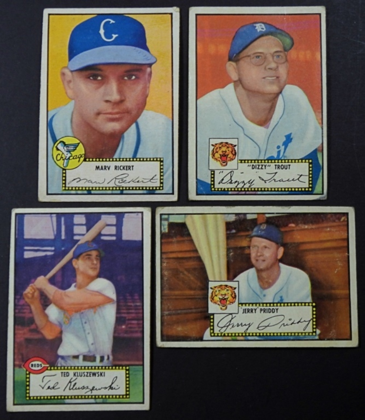 4 1952 TOPPS BASEBALL CARDS, PLAYERS (MARV RICKERT, “DIZZY” TROUT, TED KLUSZEWSKI, “JERRY” PRIDDY), CONDITION VG-VGEX OVERALL