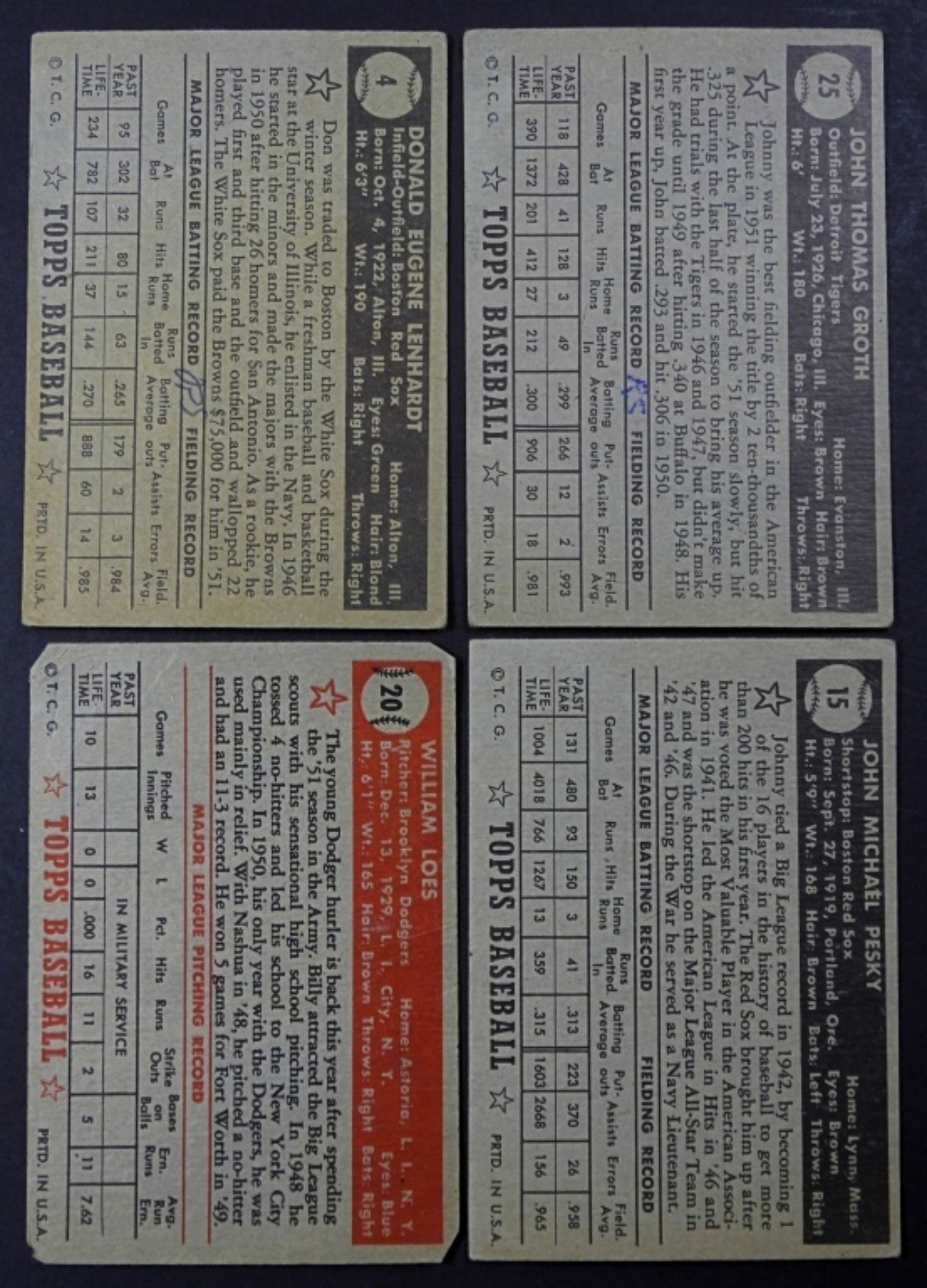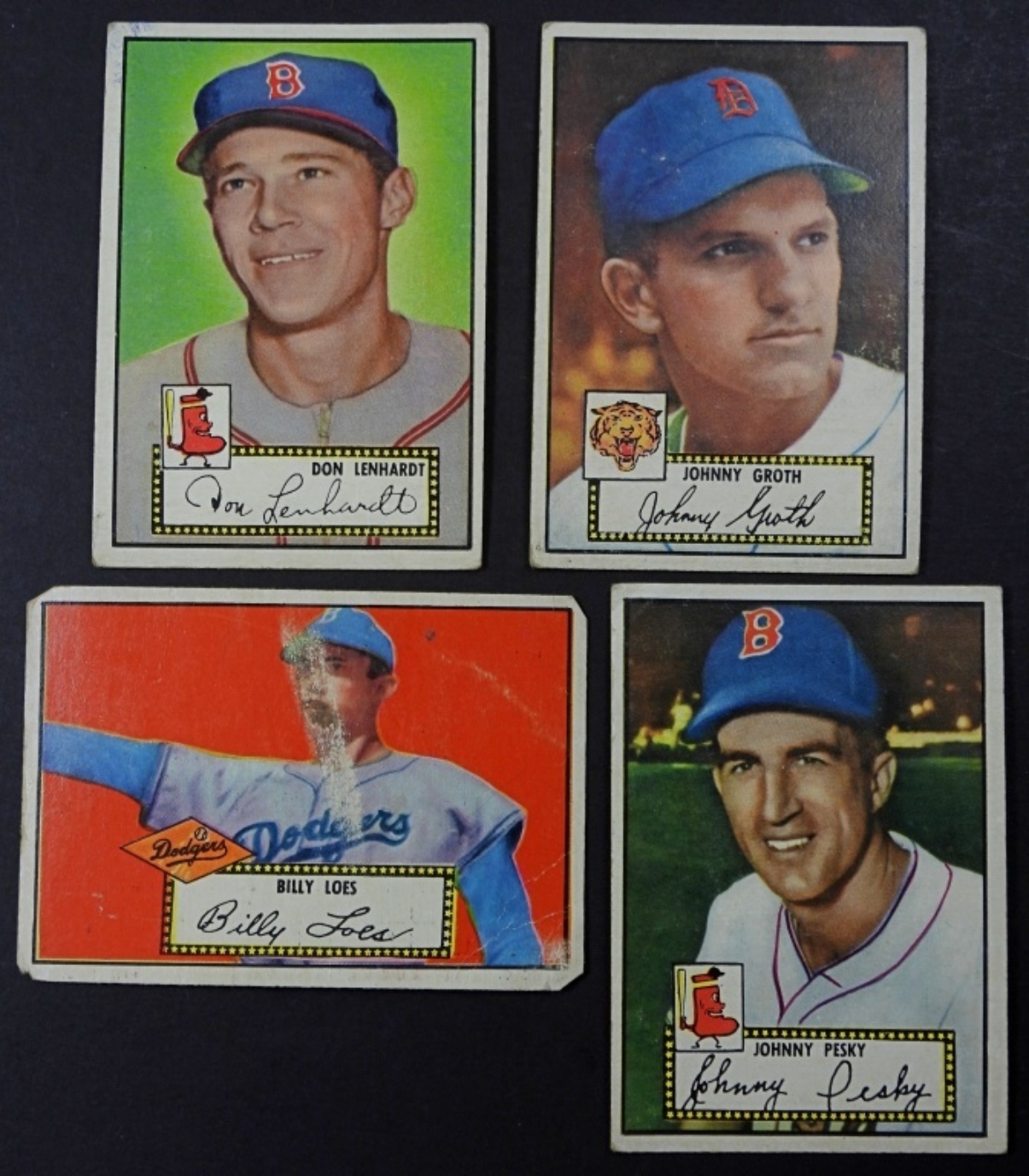 4 1952 TOPPS BASEBALL CARDS, PLAYERS (DON LENHARDT, JOHNNY PESKY, BILLY LOES, JOHNNY GROTH), CONDITION VG-VGEX OVERALL