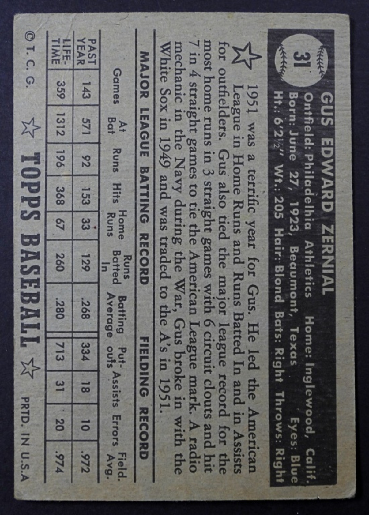 1952 GUS ZERNIAL TOPPS BASEBALL CARD, CONDITION VG-VGEX OVERALL