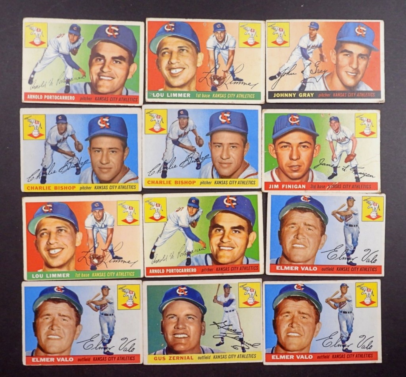 12-1955-TOPPS-KANSAS CITY ATHELTICS- ARNOLD PORTOCARRERO (PITCHER), CHARLIE BISHOP (PITCHER), LOU LIMMER (1ST BASE). ALL OF THESE CARDS ARE IN VG/GOOD OR BETTER CONDITION. PREOWNED.