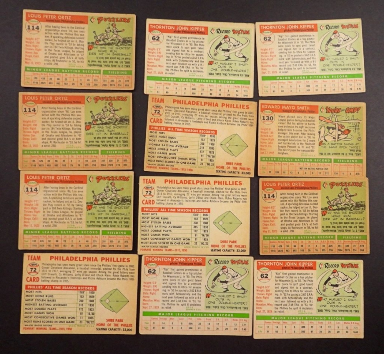 12-1955-TOPPS-PHILADELPHIA PHILLES- MAYO SMITH (MANAGER), THORTON KIPPER (PITCHER), PHILADELPHIA PHILLES (TEAM CARD). ALL OF THESE CARDS ARE IN VG/GOOD CONDITION. PREOWNED.