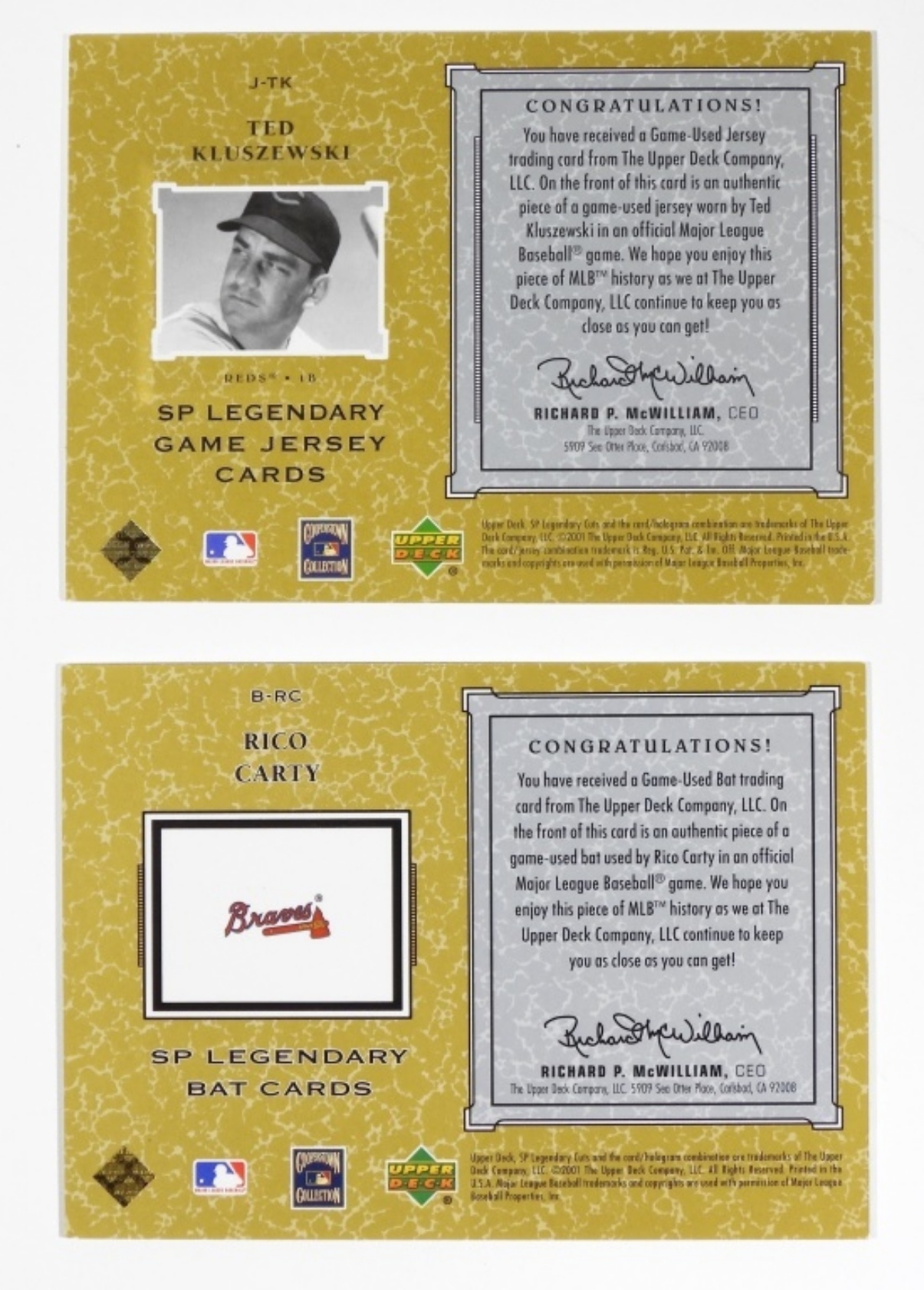 TED KLUSZEWSKI GAME JERSEY CARD & RICO CARTY BAT CARD