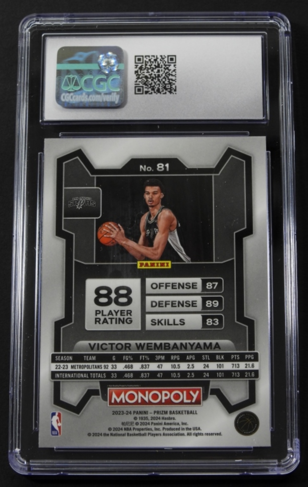2023-24- PANINI PRIZM MONOPOLY- #81 VICTOR WEMBANYAMA- CC- 9.5 MINT. PREOWNED.