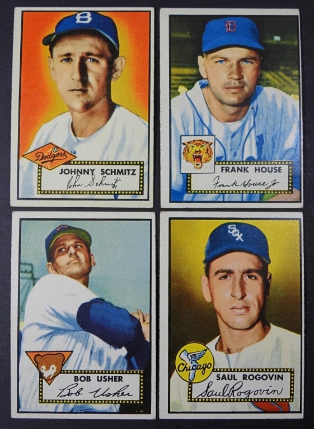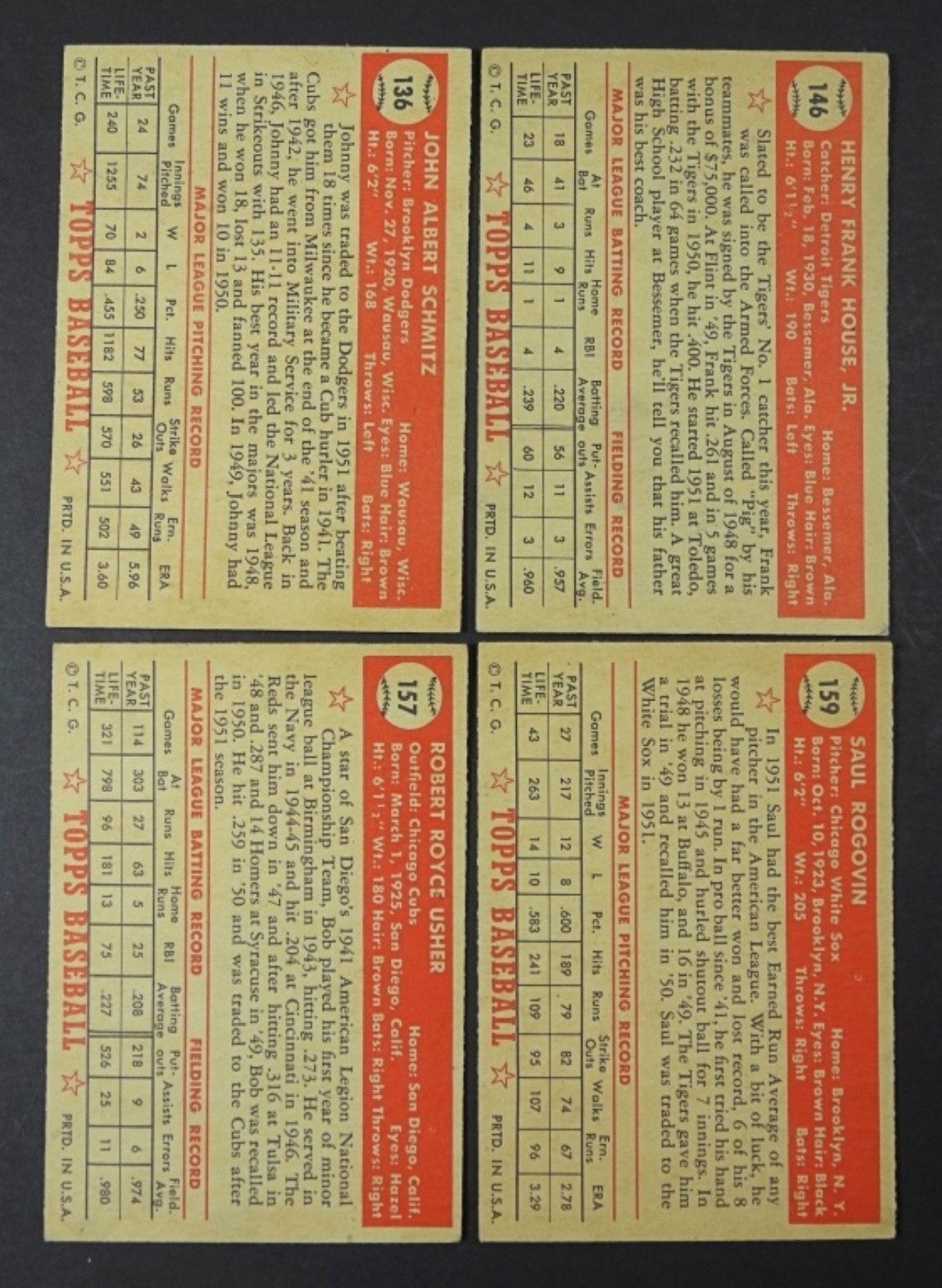 4 1954 TOPPS BASEBALL CARD, PLAYERS (JOHNNY SCHMITZ, FRANK HOUSE, BOB USHER, SAUL ROGOVIN), CONDITION VG-VGEX OVERALL