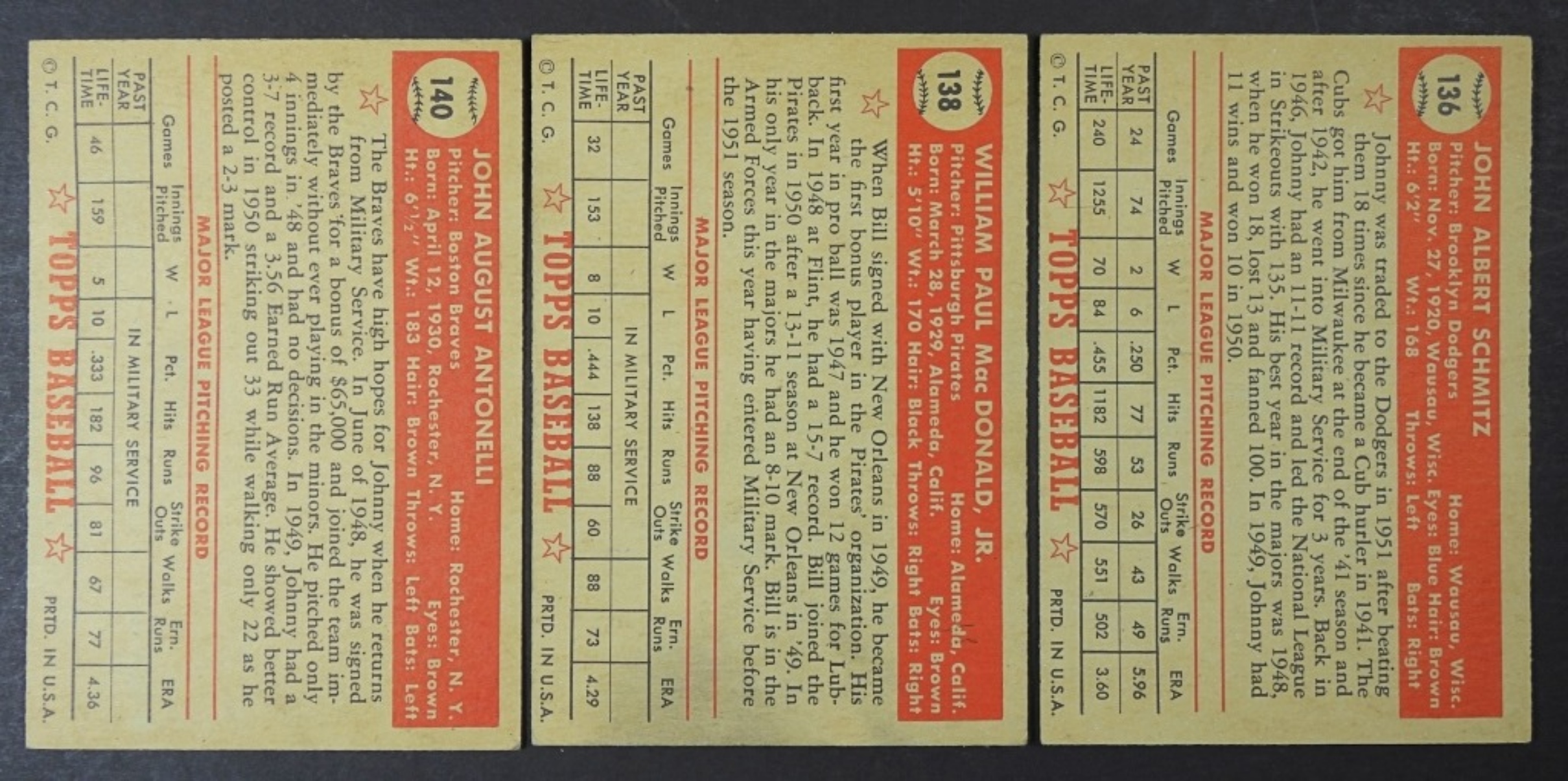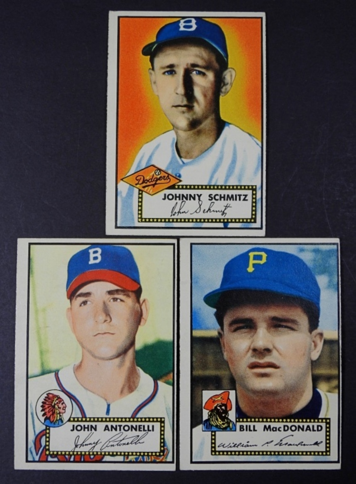 3 1954 TOPPS BASEBALL CARD, PLAYERS (BILL MACDONALD, JOHNNY SCHMITZ, JOHN ANTONELLI), CONDITION VG-VGEX OVERALL