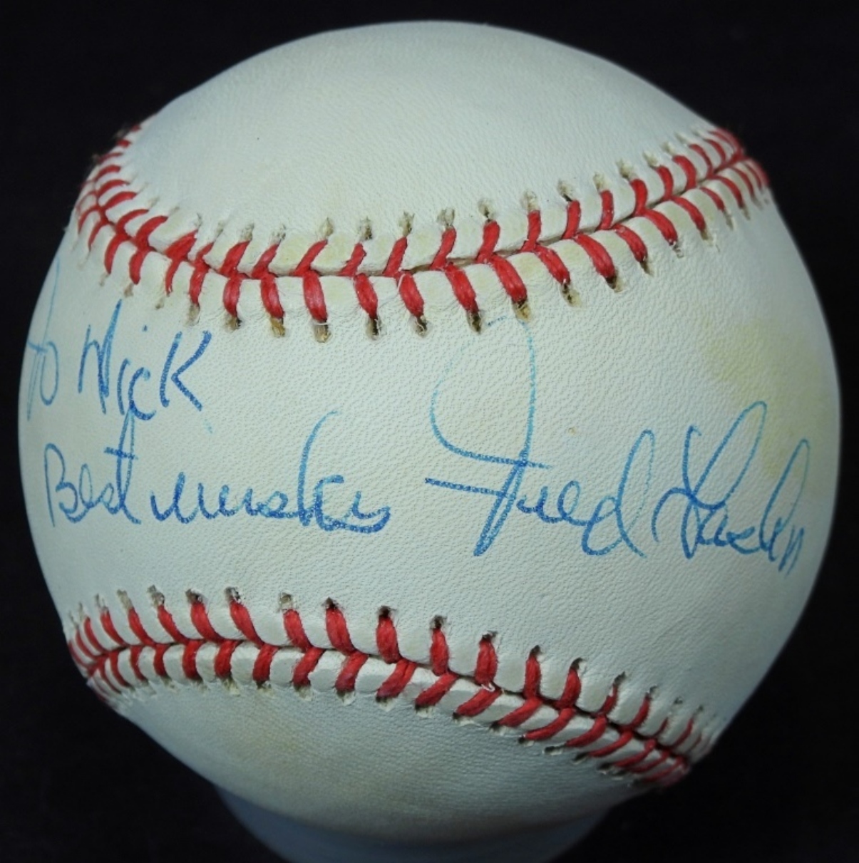 AUTOGRAPHED “TO NICK” FRED PARKER BASEBALL, UNVERIFIED, IN PROTECTIVE CASING NO COA