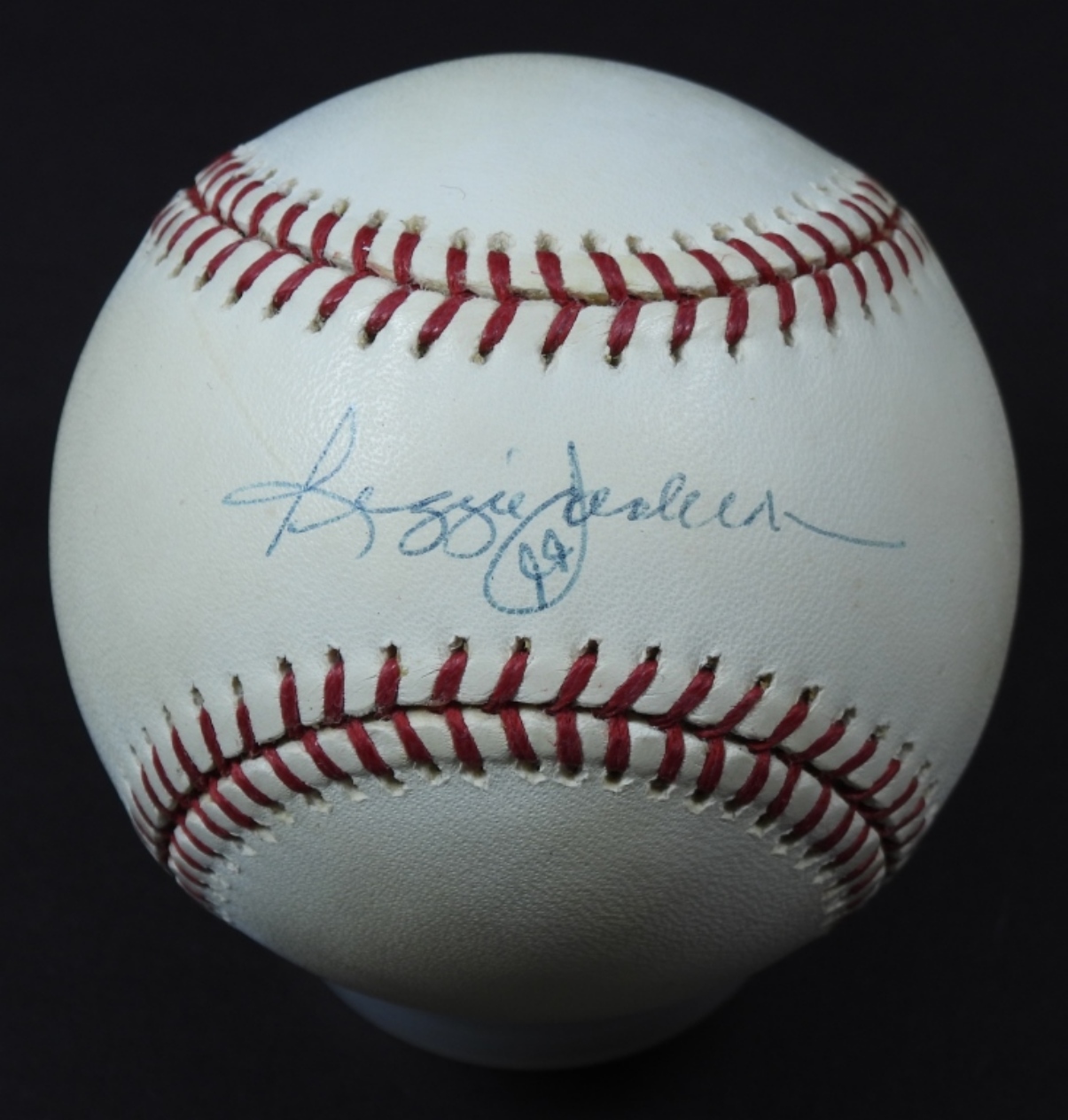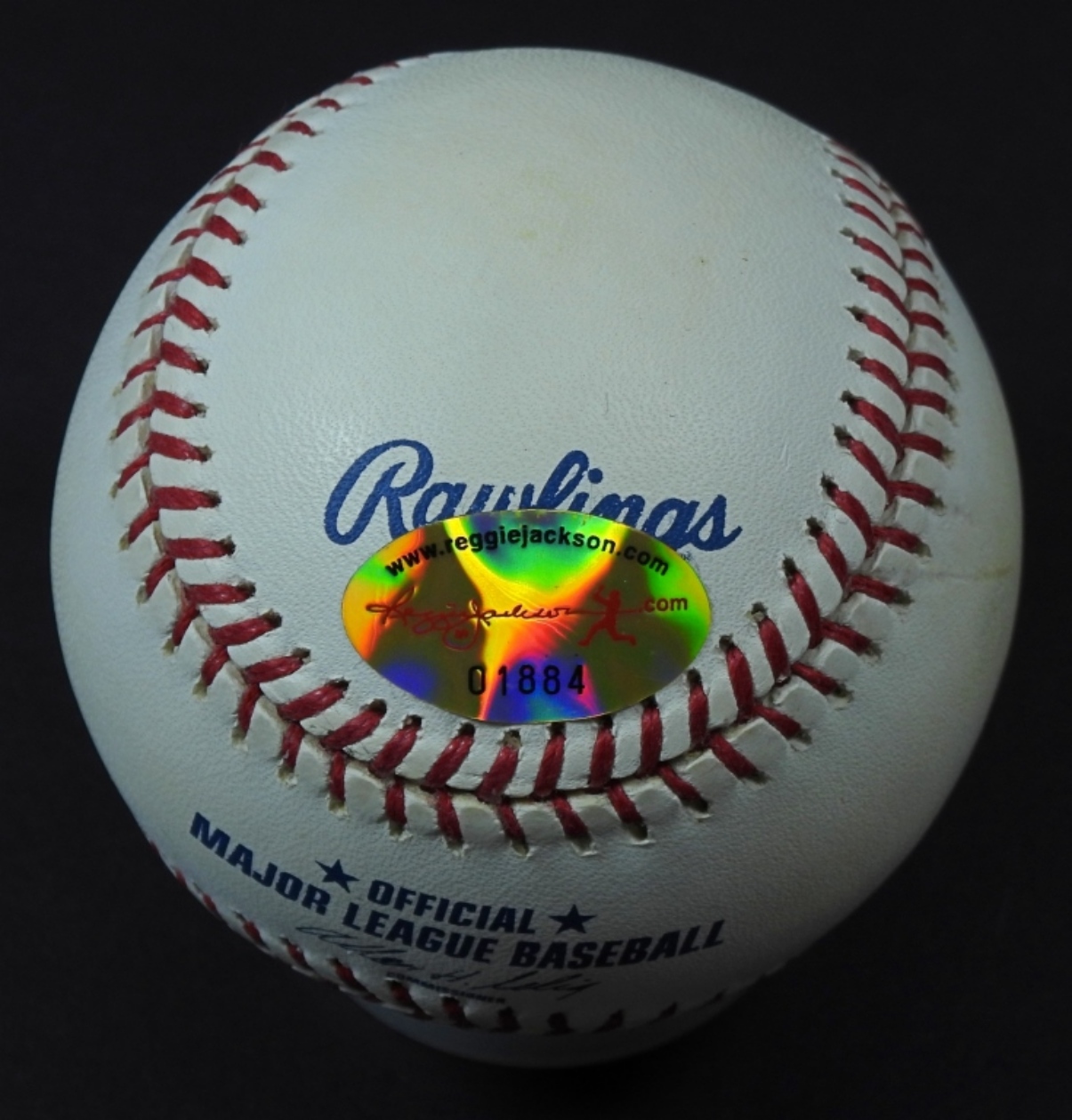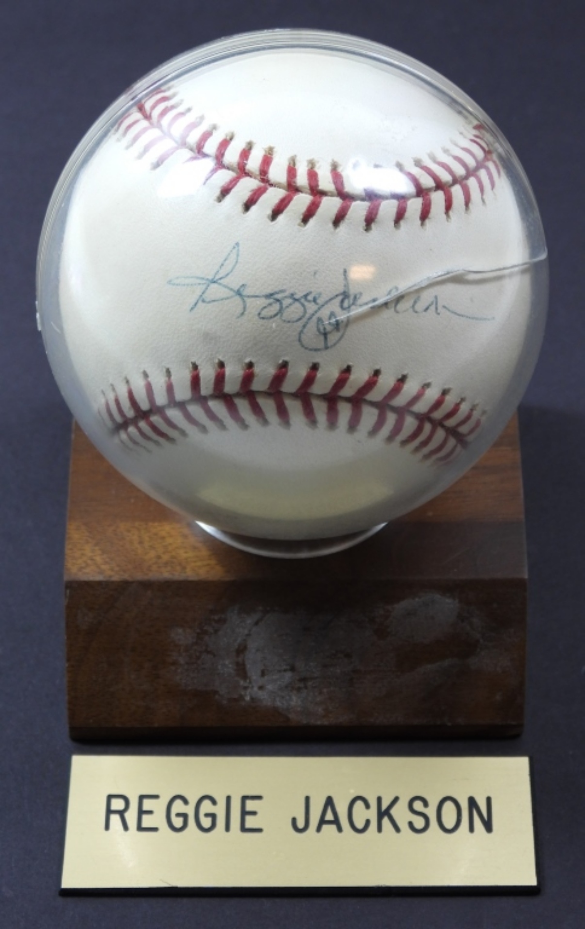 REGGIE JACKSON AUTOGRAPHED BASEBALL, IN PROTECTIVE CASING, NAME PLAQUE IS FALLING OFF, UNVERIFIED