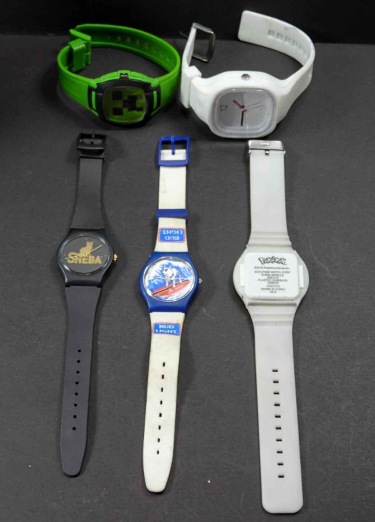 5 assorted novelty watches, untested as to working or not, most will need battery replacements, some for parts or repair, some may not work, various sizes and brands