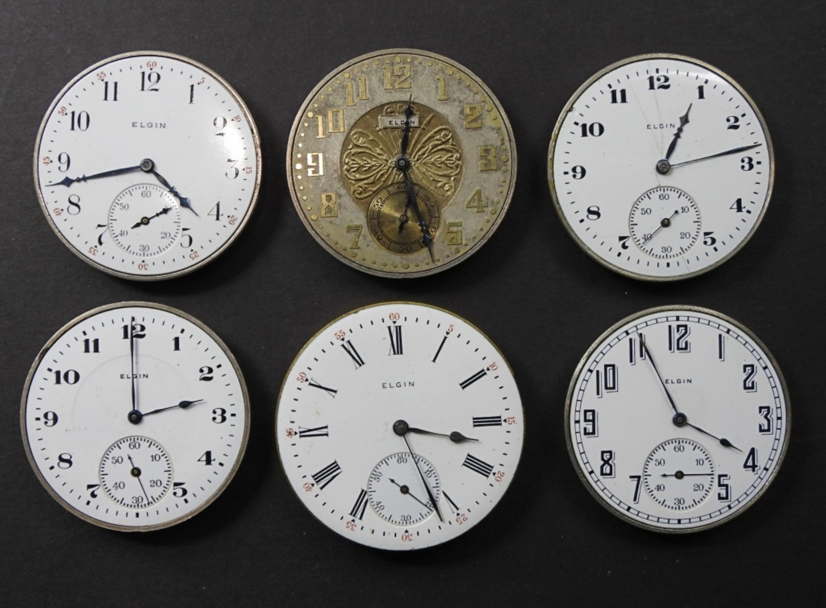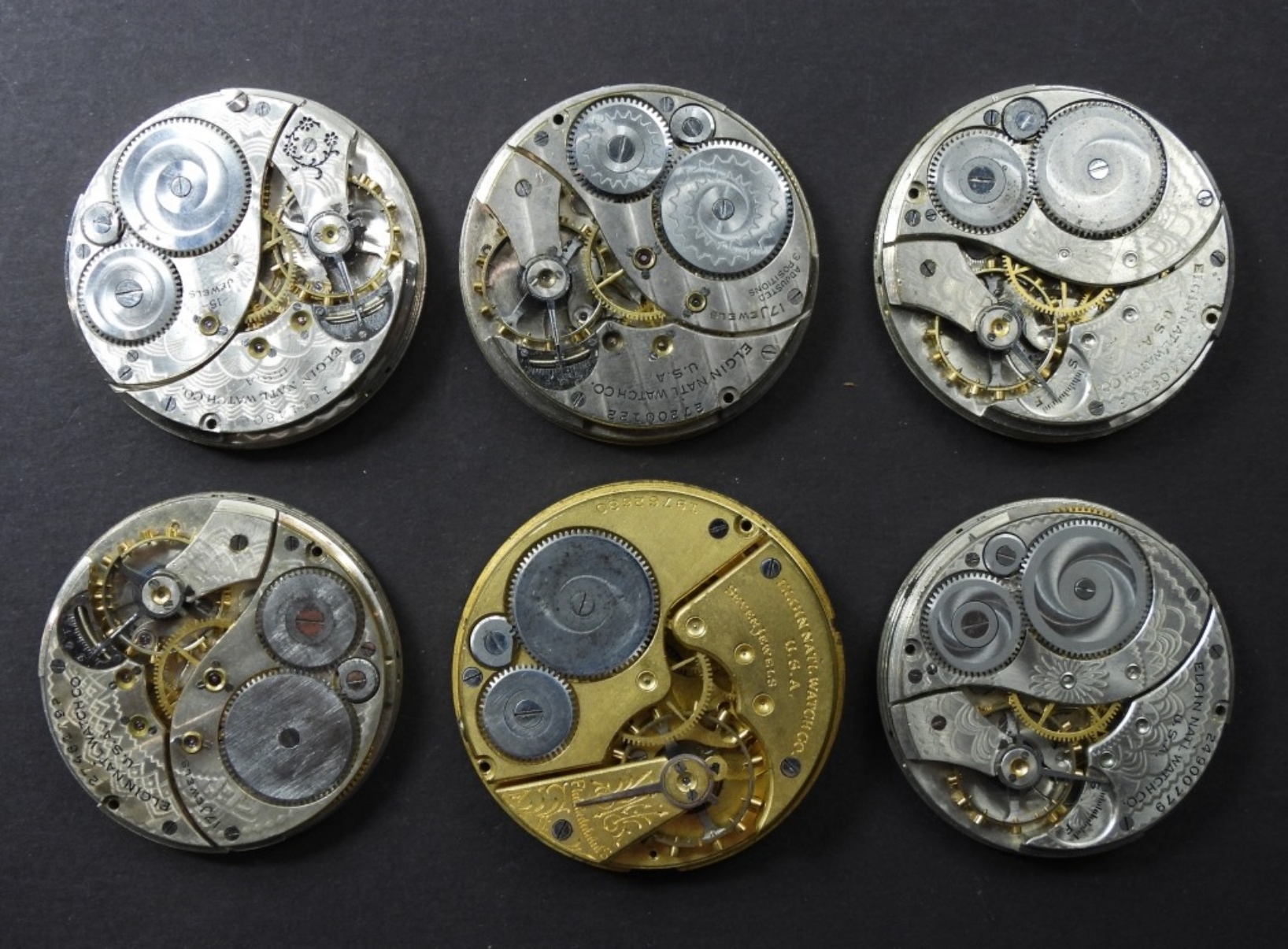 (6) POCKET WATCH MOVEMENTS SIZE 12, FOR PARTS/REPAIR, (ELGIN)