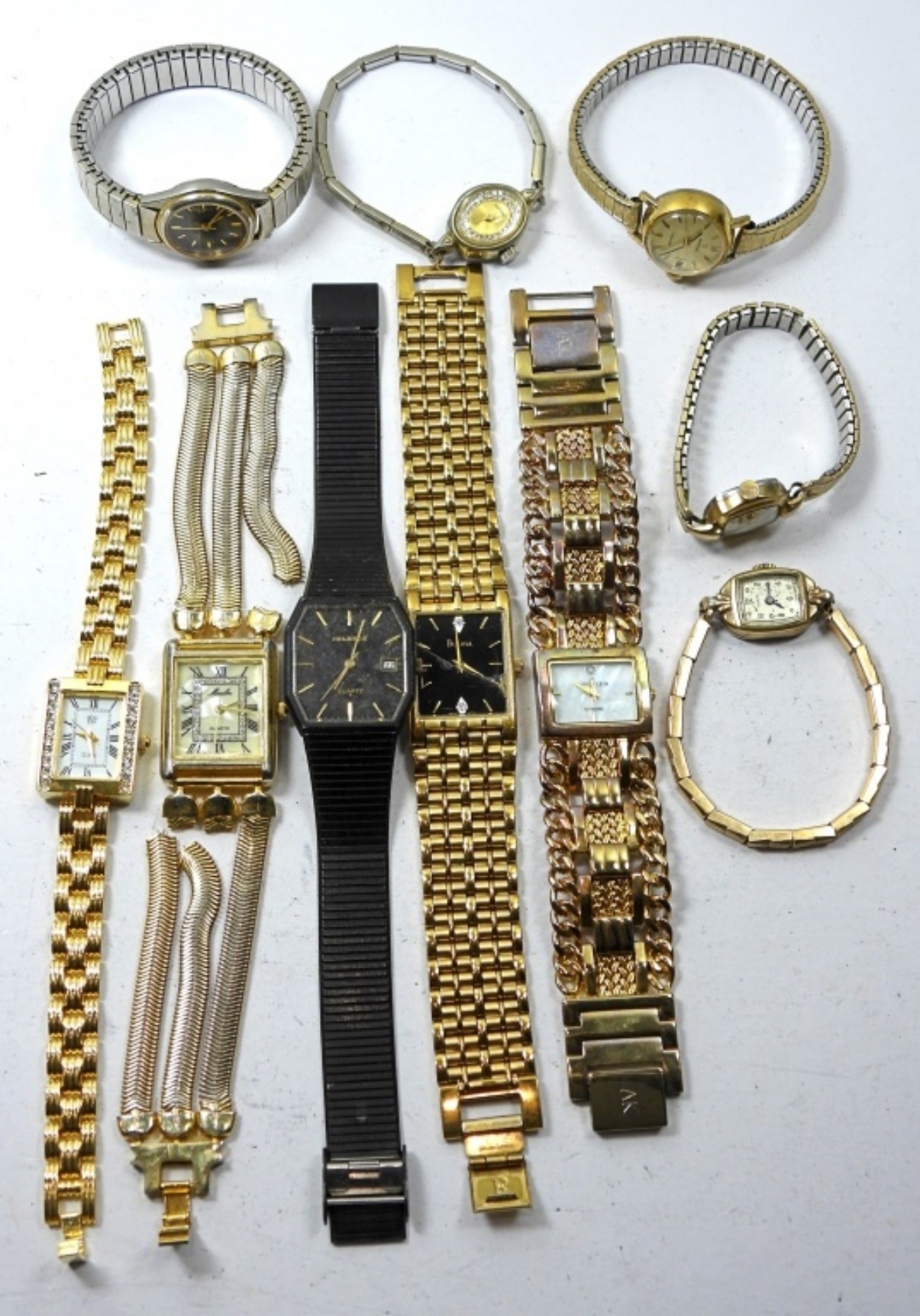 10 ladies watches, better brands, not tested as to working or not – most will need battery replacements – some for parts or repairs, some may work